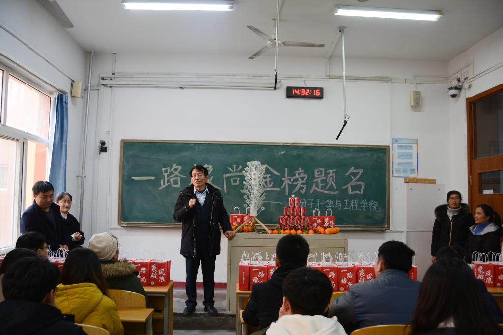 12月15日,为给学院近600名考研学子加油鼓劲,高分子学院开展“研”途送温暖,助力考研梦活动。学院党委书记孙洪广、党委副书记兼副院长尤亭亭、副院长王庆富及毕业生辅导员、班主任代表来到考研教室为同学们送上精心定制的考研加油礼包,送去暖心的祝福。