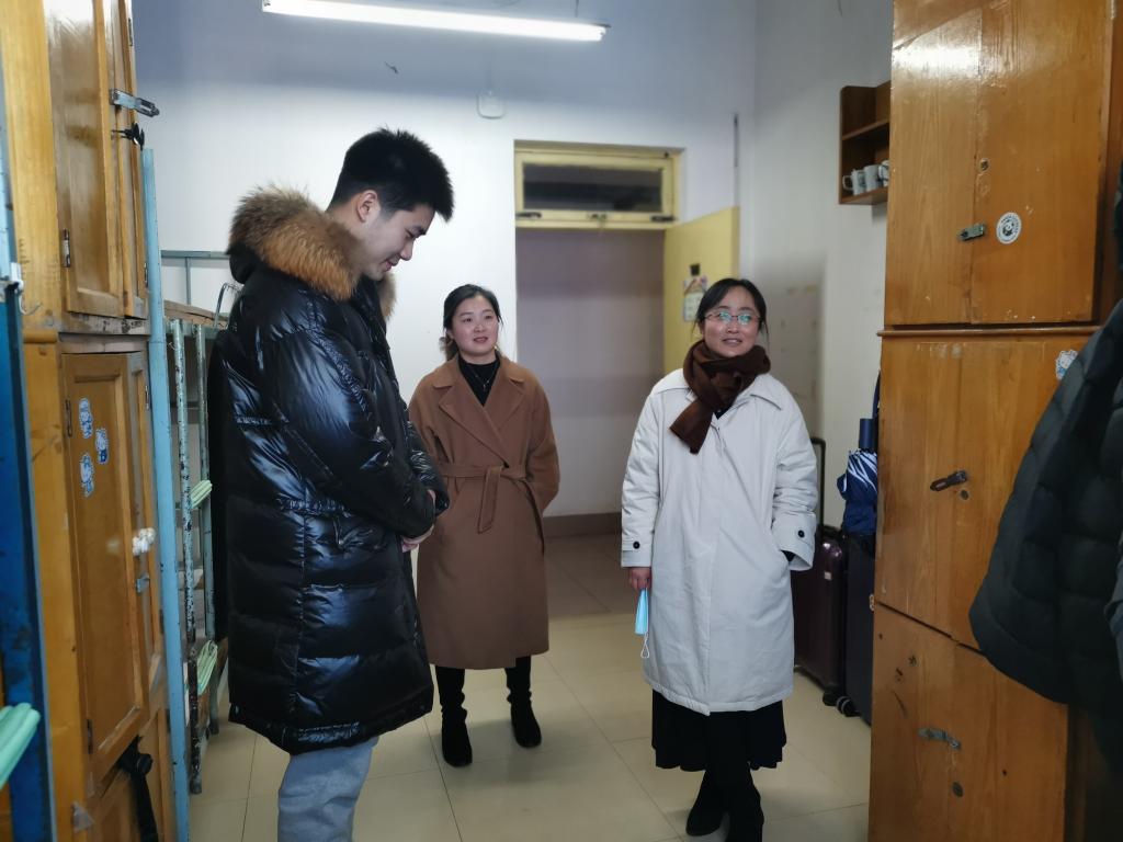 尤亭亭与延期离校的聂同学亲切交谈,了解学生目前的学习生活情况,详细询问了学生目前面临的问题与困难,及时解答并予以帮助,叮嘱学生疫情期间要加强体育锻炼、注意饮食与作息,并提醒学生注意宿舍的用电安全,度过一个安全、充实、愉悦的寒假生活。