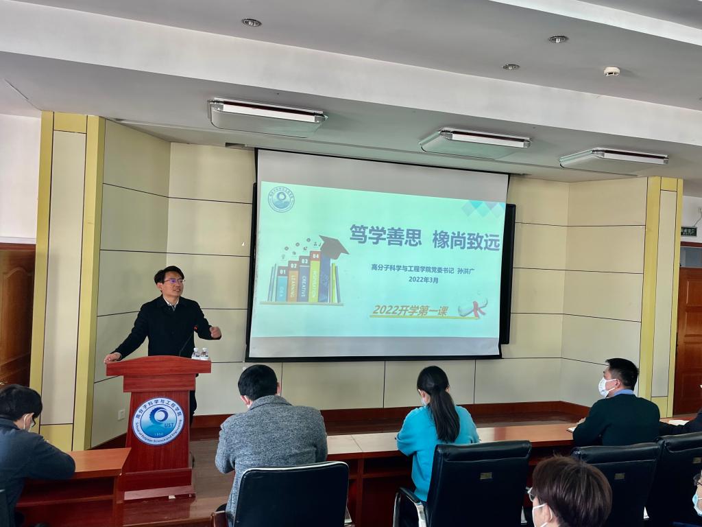 高分子学院“开学第一课”,从学风建设开始。为进一步强化学院学风建设,营造良好的学习氛围,激发大学生学习干劲,3月8日,学院党委书记孙洪广以“笃学善思,橡尚致远”为主题,为学生带来“开学第一课”。