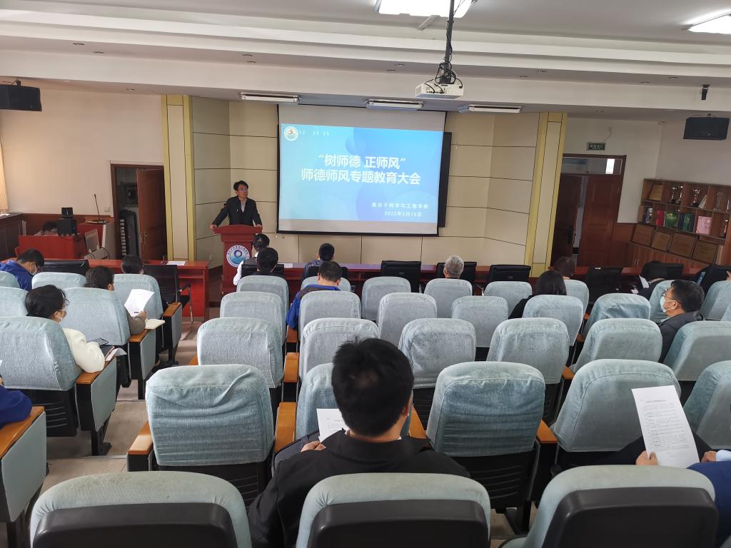 会上,党委书记孙洪广解读了学校《“树师德 正师风”专项整治活动实施方案》和《师德师风考核评价实施办法(试行)》。结合习近平总书记最近在中国人民大学考察调研时的讲话,要求全院教师认真学习,深刻理解“为谁培养人、培养什么人、怎样培养人”始终是教育的根本问题。对教师来说,想把学生培养成什么样的人,自己首先就应该成为什么样的人。培养社会主义建设者和接班人,迫切需要我们的教师既精通专业知识、做好“经师”,又涵养德行、成为“人师”,努力做精于“传道授业解惑”的“经师”和“人师”的统一者。教育是一门“仁而爱人”的事业,有爱才有责任。广大教师要严爱相济、润己泽人,以人格魅力呵护学生心灵,以学术造诣开启学生智慧,把自己的温暖和情感倾注到每一个学生身上,让每一个学生都健康成长,让每一个孩子都有人生出彩的机会。老师应该有言为士则、行为世范的自觉,不断提高自身道德修养,以模范行为影响和带动学生,做学生为学、为事、为人的大先生,成为被社会尊重的楷模,成为世人效法的榜样。