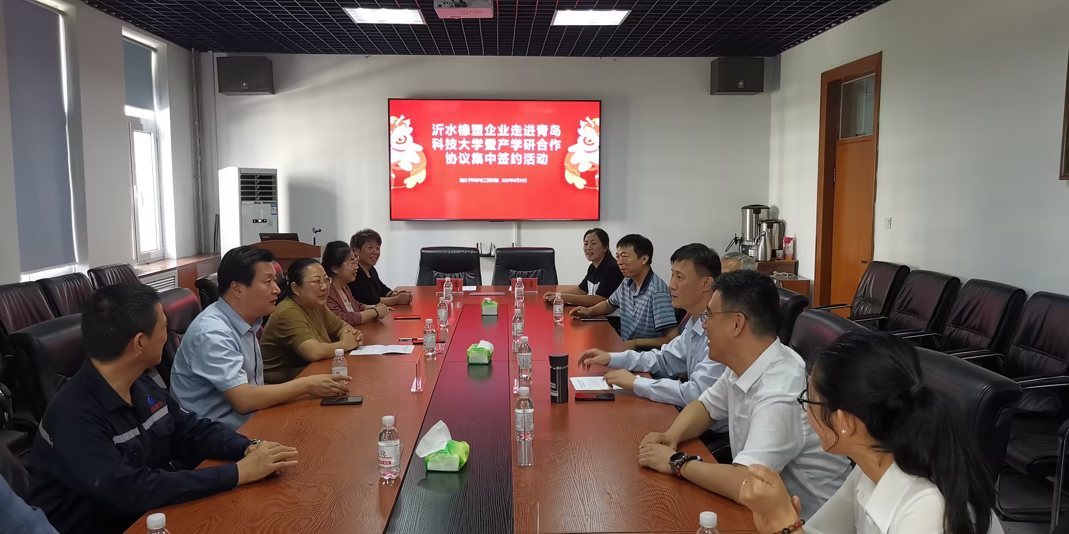 9 月 30 日,沂水橡塑企业走进青岛科技大学暨产学研合作协议集中签约活动在高分子楼403举行。青岛科技大学高分子科学与工程学院院长、橡塑材料与工程教育部重点实验室主任闫业海,俄罗斯工程院外籍院士、山东省橡胶材料科学与工程高等学校实验室主任张学全,高分子科学与工程学院相关专家教授,沂水县委常委、组织部部长闫从发及沂水县委组织部、沂水经济开发区相关负责同志,山东双圆密封科技有限公司、临沂京援鞋业有限公司、 山东峰泉新材料有限公司等企业主要负责人参加。