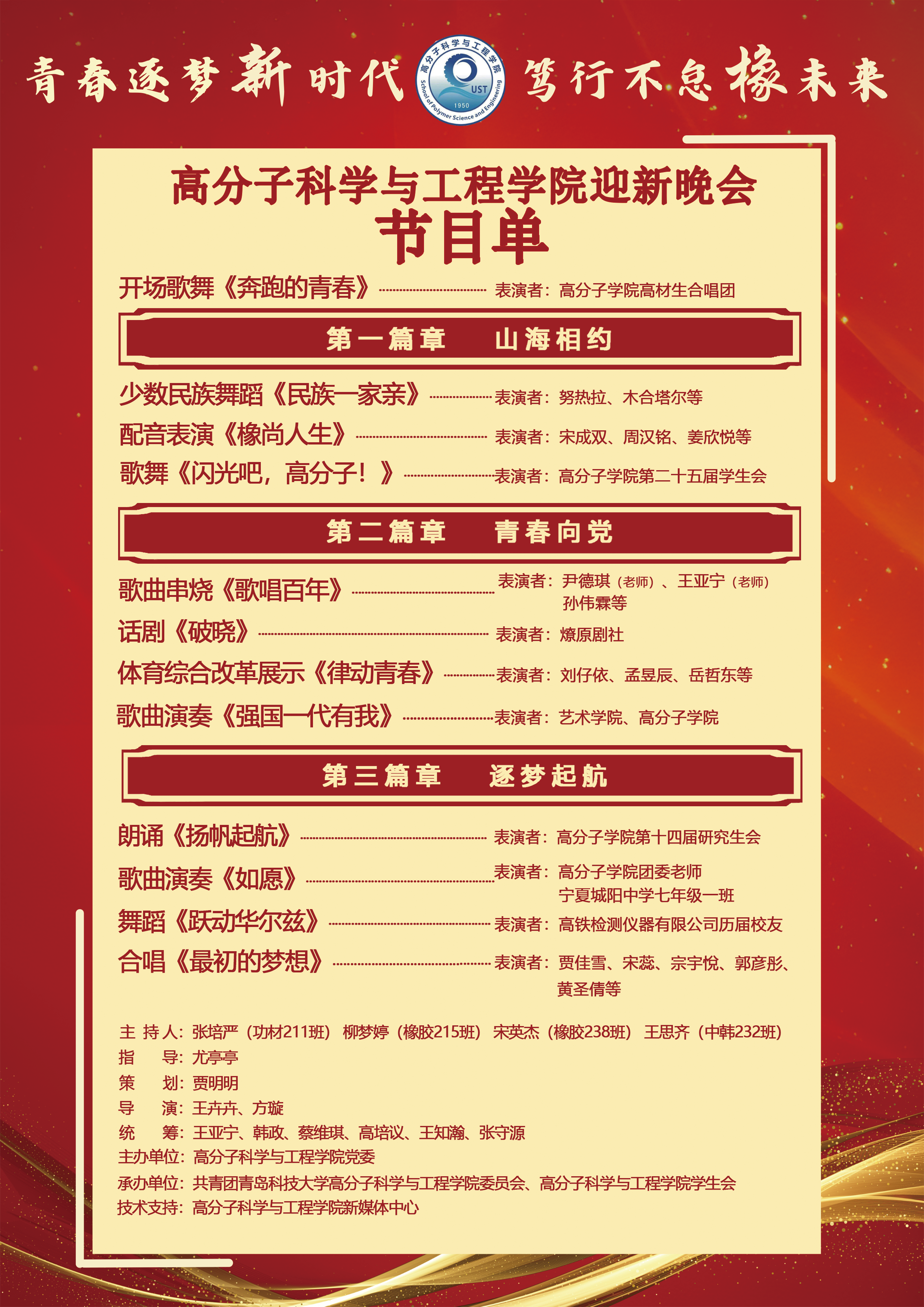 晚会以“青春逐梦新时代,笃行不怠´橡´未来”为主题,分为《山海相约》《青春向党》《逐梦起航》三个篇章。寓意着在党的二十大胜利召开的新时代背景下,来自五湖四海的各族青年才俊汇聚高分子学院,以学院为平台,以“科大精神、橡胶品格、五有理念”为精神内核,努力学习科学文化知识,提高自身综合素质,坚定共产主义信仰,共同为中华民族的伟大复兴而奋斗。