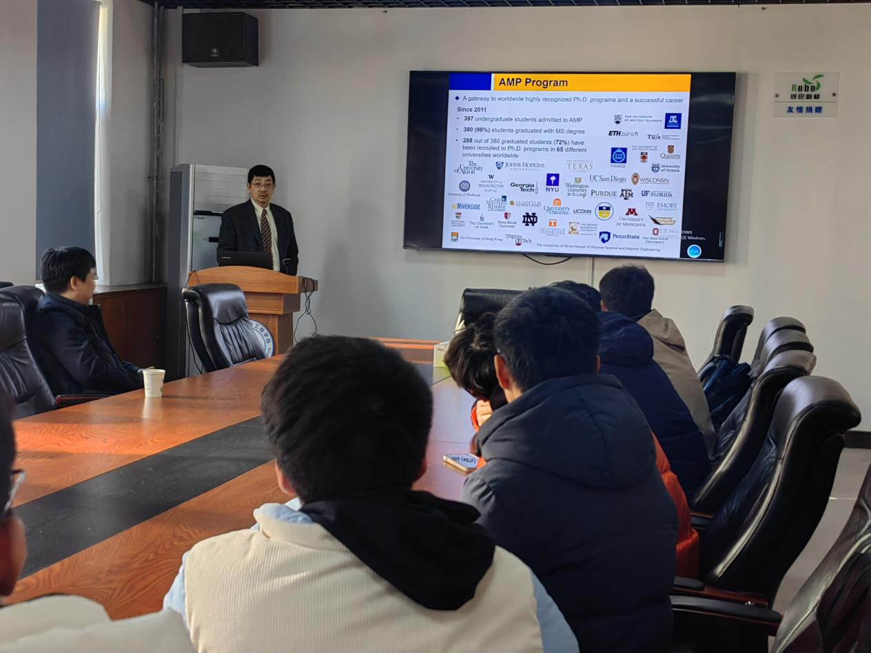 12月19日上午,青岛科技大学与美国阿克隆大学合作的“3+2”联合培养硕士项目宣讲会在学院401报告厅举行,宣讲会由高分子学院副院长王庆富主持,阿克隆大学教授贾力主讲。宣讲会详细介绍了项目来源、招生条件、毕业要求、留学费用等,并与现场同学就相关问题进行了互动交流。此次招生项目主要面向2021级本科生,同时吸引了部分2022级本科生参加。会后,贾力教授对5名同学一对一地进行了面试。