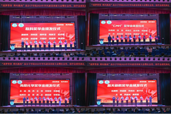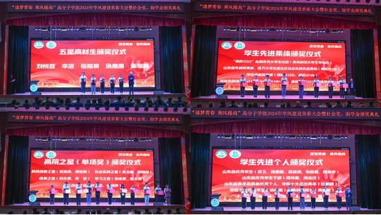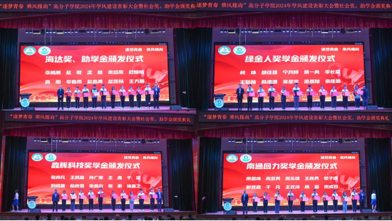 学院党委书记宣宗伟宣读《关于表彰2023年度学风建设先进集体及高院之星的决定》;副院长王庆富宣读《关于表彰2023年度社会奖、助学金获得者的决定》,奖助学金捐赠企业代表和学校、学院相关部门负责人一起为获奖学生颁发了获奖证书;获奖学生代表橡胶215班柳梦婷同学做了发言。
