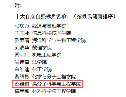 根据《青岛科技大学“十大自立自强标兵”评选办法》,学校于2024年6月启动第二十届“十大自立自强标兵”评选活动,经学生申请、学院推荐、资格审核、现场答辩等环节,我院高材实验211班蔡维琪同学凭借过硬的思想政治素质、优异的专业学习成绩及自立自强的精神,在众多优秀学生中脱颖而出,被评为“十大自立自强标兵”。