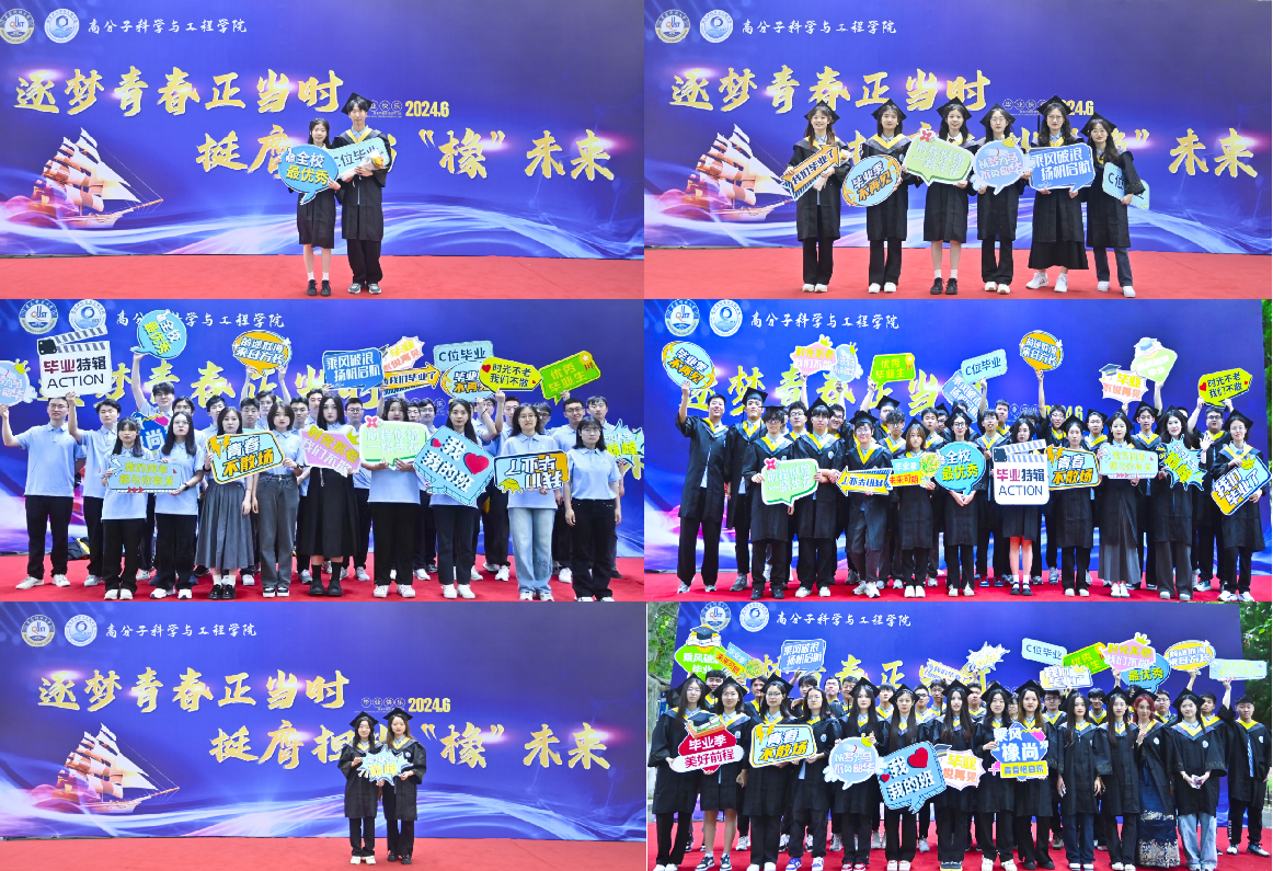 乘风破浪潮头立,扬帆起航正当时,高分子学院通过开展毕业季特色拍摄活动,在立足“以生为本”、服务毕业生的同时,也满足了毕业生纪念校园生活、回忆同窗情谊等情感需求,不仅为离校毕业生留下一段美好而难忘的回忆,也表达了学院对全体毕业生的殷切期盼,祝福全体毕业生在今后工作岗位上不断作出新的更大贡献,在未来的人生道路上勇攀高峰、再创佳绩。