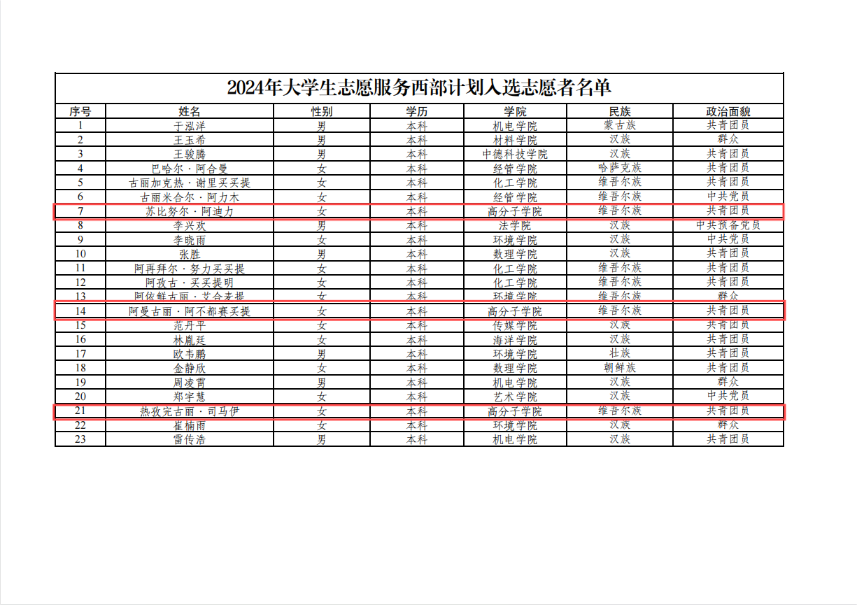 大学生志愿服务西部计划是经国务院常务会议决定,由共青团中央、教育部、财政部、人力资源社会保障部共同组织实施的一项重大人才工程,是推动优秀大学生服务乡村建设,投身强国伟业,书写奋斗青春的战略部署。自接到上级工作指示,学院高度重视西部计划志愿者宣传工作,经学生个人报名、学院团委推荐、校团委审核、笔试、面试等环节,学院阿曼古丽·阿不都赛买提,热孜完古丽·司马伊,苏比努尔·阿迪力同学成功入选2024年大学生志愿服务西部计划志愿者。