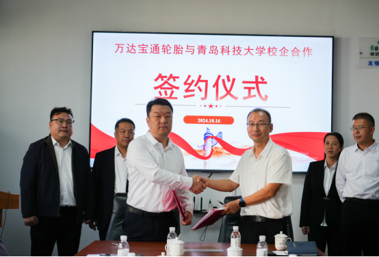 青岛科技大学高分子科学与工程学院与山东万达宝通轮胎有限公司成功签约,是双方发挥各自优势、强强联合的又一项校企合作。双方将充分发挥对绿色轮胎产业发展的带动作用,加强沟通交流,积极开展实质性合作,共同破解绿色轮胎发展难题,提升产品的附加值,引领绿色轮胎技术创新,谱写合成橡胶应用的新篇章。