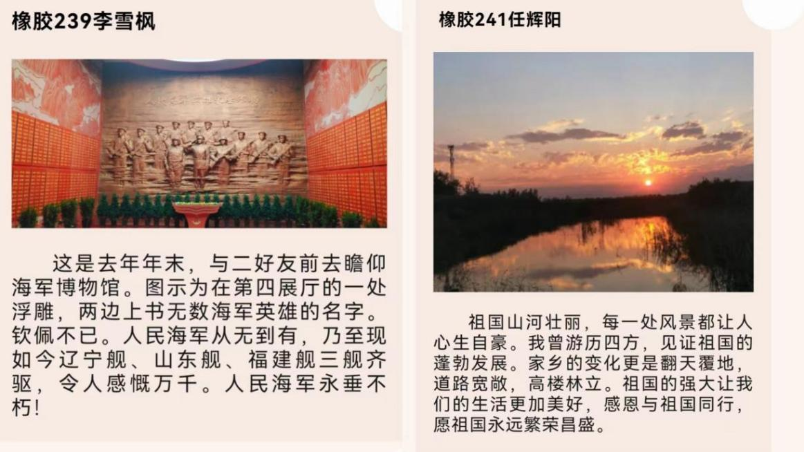 开展“国庆印记,心旅共享”出游照片及感悟线上收集活动。同学们在领略祖国大好河山留下美好记忆的同时,抓拍国庆假期美好瞬间,分享旅途中的感悟,弘扬了爱国主义精神。同学们誓将以“橡尚”青年的姿态,奋力前行,在时代的浪潮中书写属于自己的辉煌篇章。
