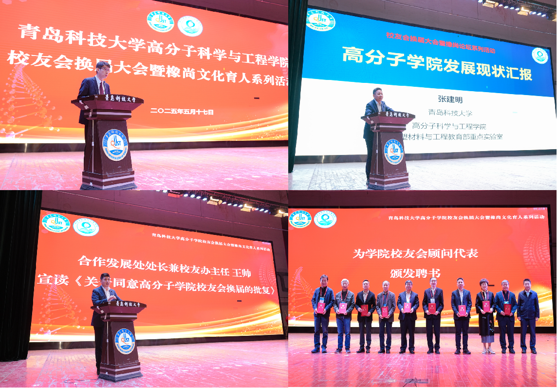 会上,吕万翔为学院聘任的校友会顾问代表及会长、常务副会长颁发了聘书。合作发展处处长兼校友办主任王帅宣读了《关于同意青岛科技大学高分子科学与工程学院校友会换届的批复》。大会审议通过了《青岛科技大学高分子科学与工程学院校友会章程》,并推举产生了青岛科技大学高分子科学与工程学院校友会第二届理事会理事及领导机构成员。