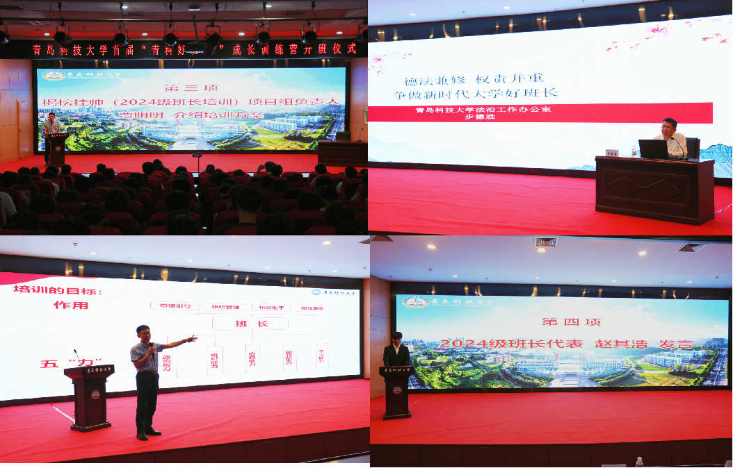 仪式上,揭榜挂帅项目(2024级班长培训)负责人贾明明介绍了《2025年青岛科技大学“青科好班长”成长训练营实施方案》。2024级班长代表赵其浩作表态发言。