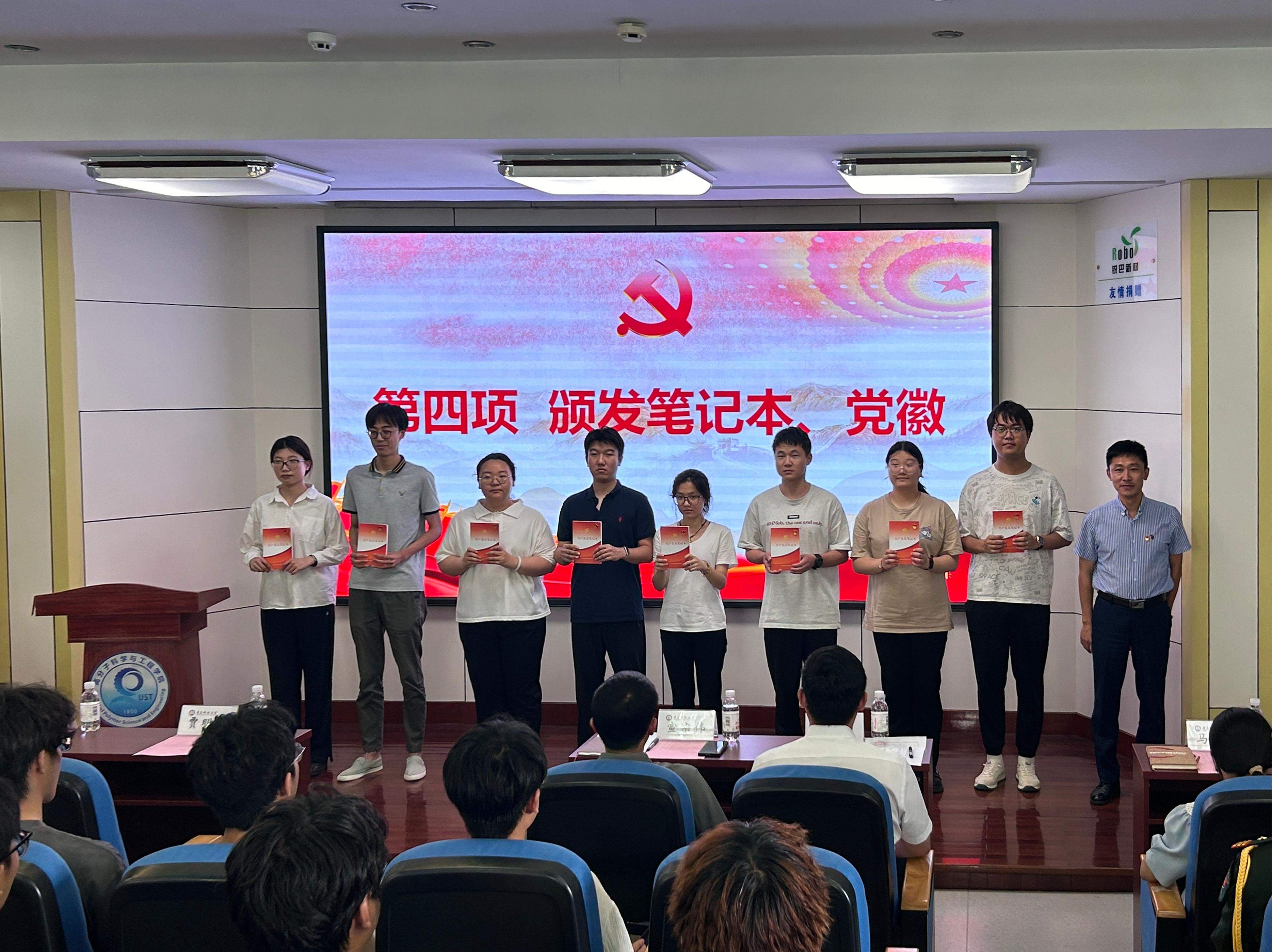 会上,高分子学院党委副书记兼副院长贾明明为新发展党员代表发放了党员徽章、共产党员笔记本,学院团委副书记兼学生工作办公室副主任尹德琪老师宣读了《高分子科学与工程学院2025年上半年新发展党员名单》。最后,全体新发展党员高举右手紧握拳头,面对鲜艳的党旗庄严宣誓。