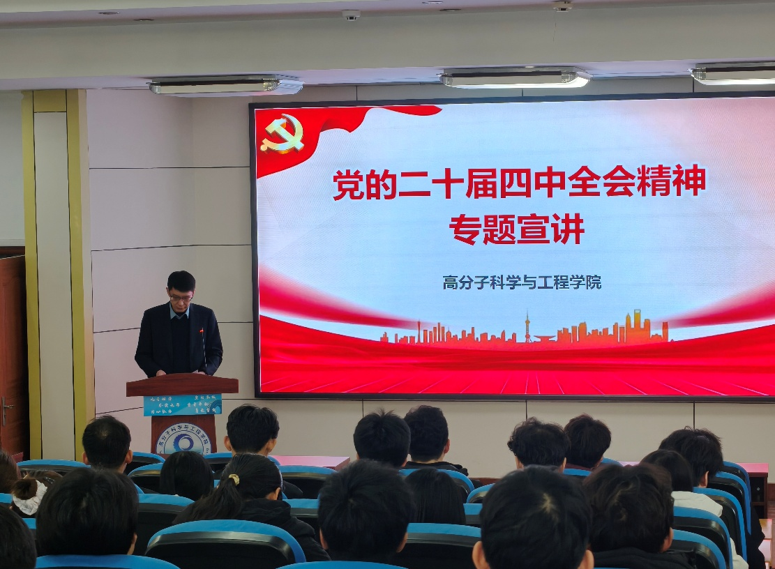 为深入学习贯彻党的二十届四中全会精神,将理论学习与专业发展、党性锤炼深度融合。12月2日,高分子学院在学院401会议室举行党的二十届四中全会精神专题宣讲暨本学期新发展学生党员入党宣誓仪式,高分子学院党委书记宣宗伟任主讲人。