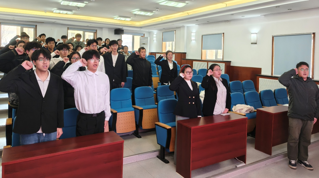 宣讲结束后,本学期新发展学生党员开展入党宣誓仪式,新发展党员们高举右拳,以铿锵有力的声音宣读入党誓词,庄严的誓言在会议室中回荡,这既是对党的郑重承诺,也是对未来践行初心使命的坚定表态。