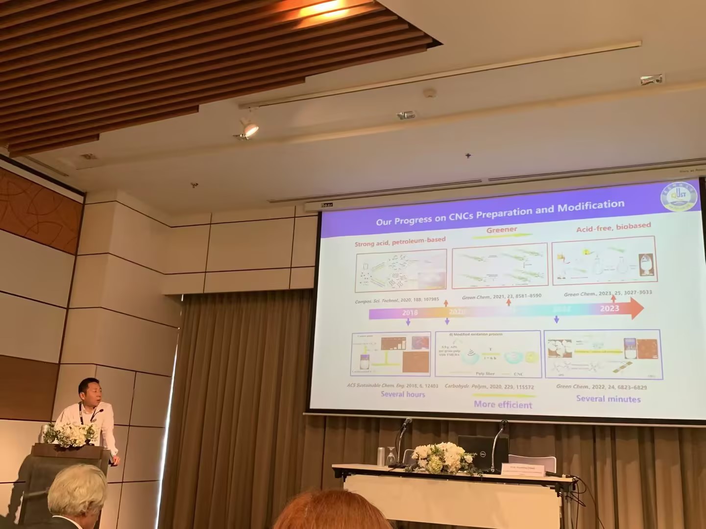 大会报告环节,德国橡胶技术研究所、京都大学、西安交通大学、印度JK轮胎工业有限公司、英国玛丽女王大学等机构的专家学者,围绕“橡胶回收循环经济的边界与机遇”“应变结晶弹性体断裂力学”“AI驱动弹性体多尺度模拟”等重大议题分享顶层洞见,为全球橡胶产业绿色转型锚定方向。分论坛研讨中,各国团队聚焦关键技术突破展开深度对话,青科大代表团的报告成为现场焦点:张建明受邀发表《Cellulose Nanocrystal: Scalable Production and Innovation and Application》(纤维素纳米晶体:规模化生产与创新应用)专题报告,引发广泛热议;刘恒教授针对《Chemical Degradation of End-of-Life Tires》(废旧轮胎的化学降解)分享核心技术路径;华静教授、汤健老师联合呈现《Synthetic Strategies and Mechanistic Studies of Liquid Rubber》(液体橡胶的合成策略与机理研究)最新成果。教师团队通过与国际顶尖学者同台报告、深度研讨,不仅获取了学科前沿动态与产业技术需求,更有效拓宽国际学术视野,锤炼跨文化科研协作与学术表达能力,为师资国际化培养筑牢实践根基。