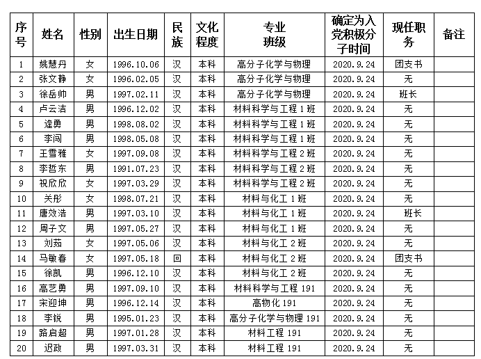 经各班级团员推优,研究生党支部无记名投票推荐,拟确定姚慧丹等同志为入党积极分子,现公示如下,如有问题,可到高分子学院团委反映。