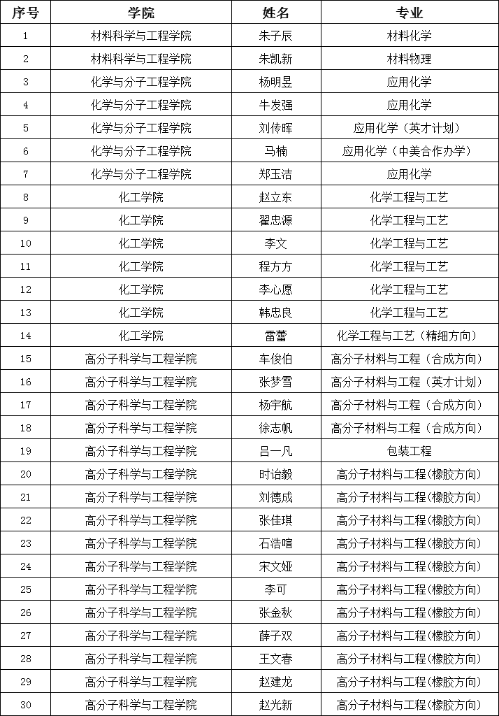 依据《青岛科技大学材料与化工卓越工程师本硕贯通培养(试点)推免工作方案》和《青岛科技大学推荐优秀应届本科毕业生免试攻读硕士学位研究生工作实施办法(试行)》,经个人申请、评审小组评审环节,确定30名同学获得青岛科技大学材料与化工卓越工程师本硕贯通培养免试攻读硕士学位研究生资格,公示如下:
