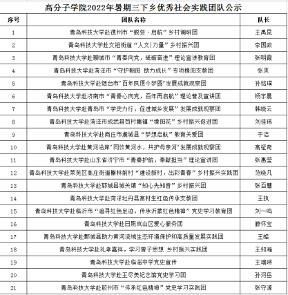 根据《关于做好青岛科技大学2022年大学生志愿者暑期文化科技卫生“三下乡”社会实践活动的通知》,经实践团队自主申报、现场成果展示、实践成果审核,共评选出 21支院级优秀社会实践团队。现将名单予以公示。