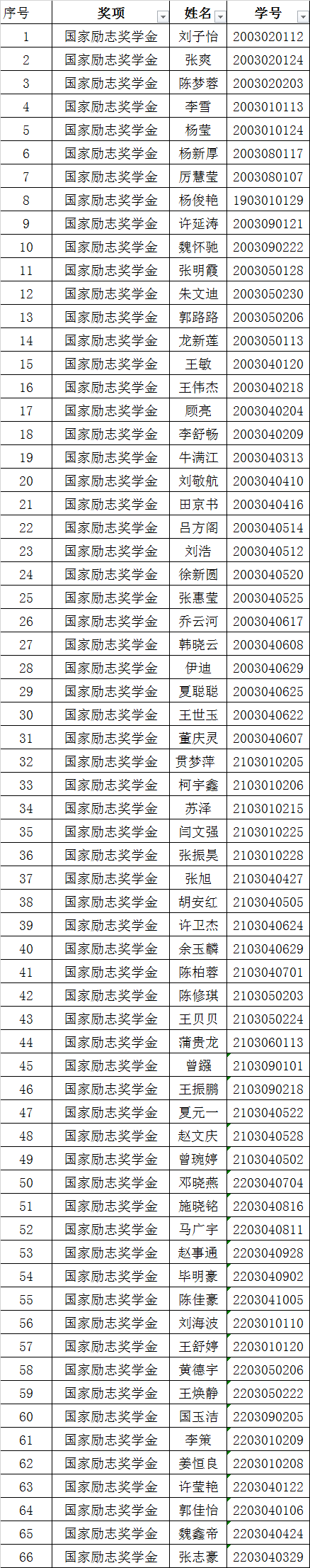 根据青岛科技大学《关于评审2022-2023学年本科生励志奖学金的通知》,结合高分子学院实际情况,经学生自主申请、学院奖学金评审委员会评审,最终评选出66人获得国家励志奖学金、6人获得省政府励志奖学金,现将名单进行公示: