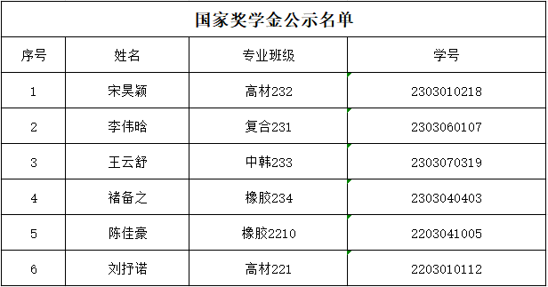 高分子学院奖学金评审委员会通过现场答辩、综合评审,最终评选出宋昊颖等6人为国家奖学金推荐人选。现将名单公示如下:
