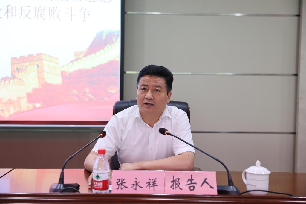 张永祥从三个方面为我校党员干部进行了深入讲解,一是深入学习习近平总书记重要论述,不断提高政治判断力、政治领悟力、政治执行力。要深学细悟习近平总书记关于党的自我革命的重要思想、关于教育科技人才的重要论述,落实全面从严治党政治责任,一体推进“三不腐”,打好作风建设持久战,深化政治巡视巡察,发挥好高校教育科技人才优势,为强国建设、民族复兴做出积极贡献。二是深刻领悟习近平总书记关于反腐败斗争的战略部署,清醒认识全面从严管党治校面临的形势和任务。要学习领会全国、全省教育系统全面从严治党工作会议精神,从高校领域存在的主要问题、发生的典型案例中汲取教训,一体推进党风政风、师德师风、校风学风建设。三是纵深推进高校领域全面从严治党,助力学校各项事业高质量发展。高校作为为党育人、为国育才的主阵地,承担着培养社会主义建设者和接班人的大计,必须坚决捍卫“两个确立”、践行“两个维护”,确保学校成为始终坚持党的全面领导的坚强阵地,确保党的教育方针重大决策部署和立德树人根本任务落到实处、见到实效,确保教育领域充盈清风正气、蓬勃朝气,确保监督全面覆盖、常态见效,确保干部队伍忠诚可靠、清正廉洁。