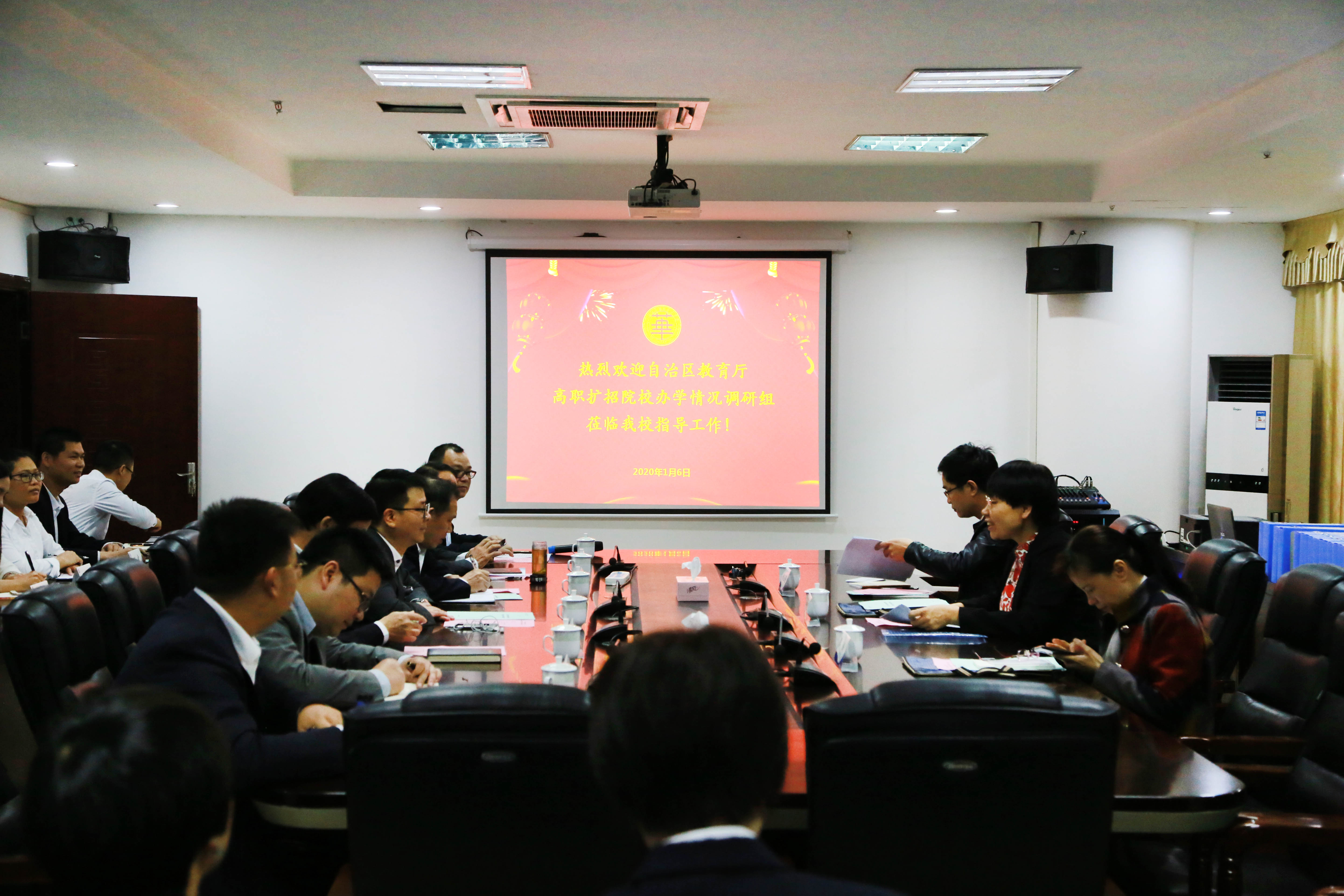 为了解高职院校扩招后的办学情况,保证人才培养质量,由广西科技大学罗秋兰、柳州铁道职业技术学院周澜、自治区教育厅民办教育管理处黄玉强组成的广西自治区教育厅高职扩招院校办学情况调研组于1月6日上午抵达我校开展调研。