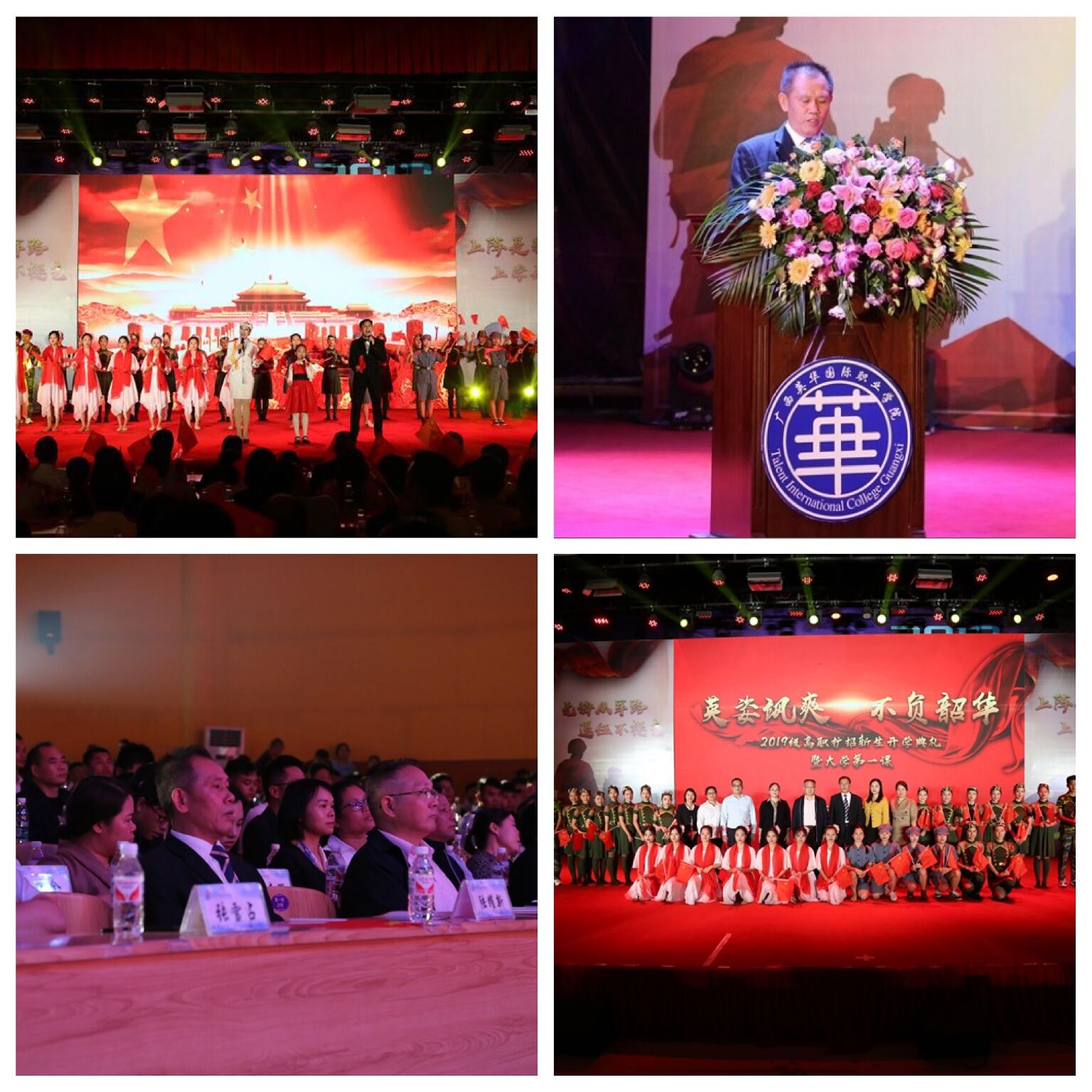 钦州市退役军人事务局党组书记、局长胡金奇,教育局副局长卢红青,学校领导班子成员及各职能部门负责人,各二级学院教师、辅导员及来自全国各地的2019级高职扩招新生1200多人出席此次典礼。