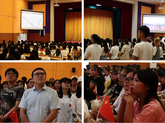 早上8时,部分同学已早早到场等候,党委副书记陶日升与各二级学院书记、留校学生共400多人一起收看阅兵盛典。军旗招展,军徽闪耀,铁甲威武……面对一幅幅激动人心的壮观画面,耳听着雄壮的《义勇军进行曲》,大家不约而同拿起国旗,肃然起立,高声合唱国歌。