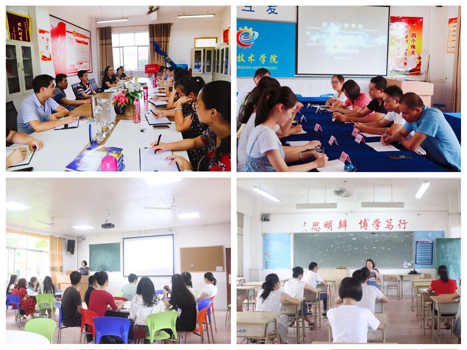 为不断提升教师的教学和管理水平全面提升教师的教学水平和创新能力,打造一流的师资队伍,7月14日下午,我校各二级学院分别就如何提升学生满意度、如何打造金课、如何开展学徒制以及如何推进共享人才培养方案的落实等主题开展教学研讨活动。