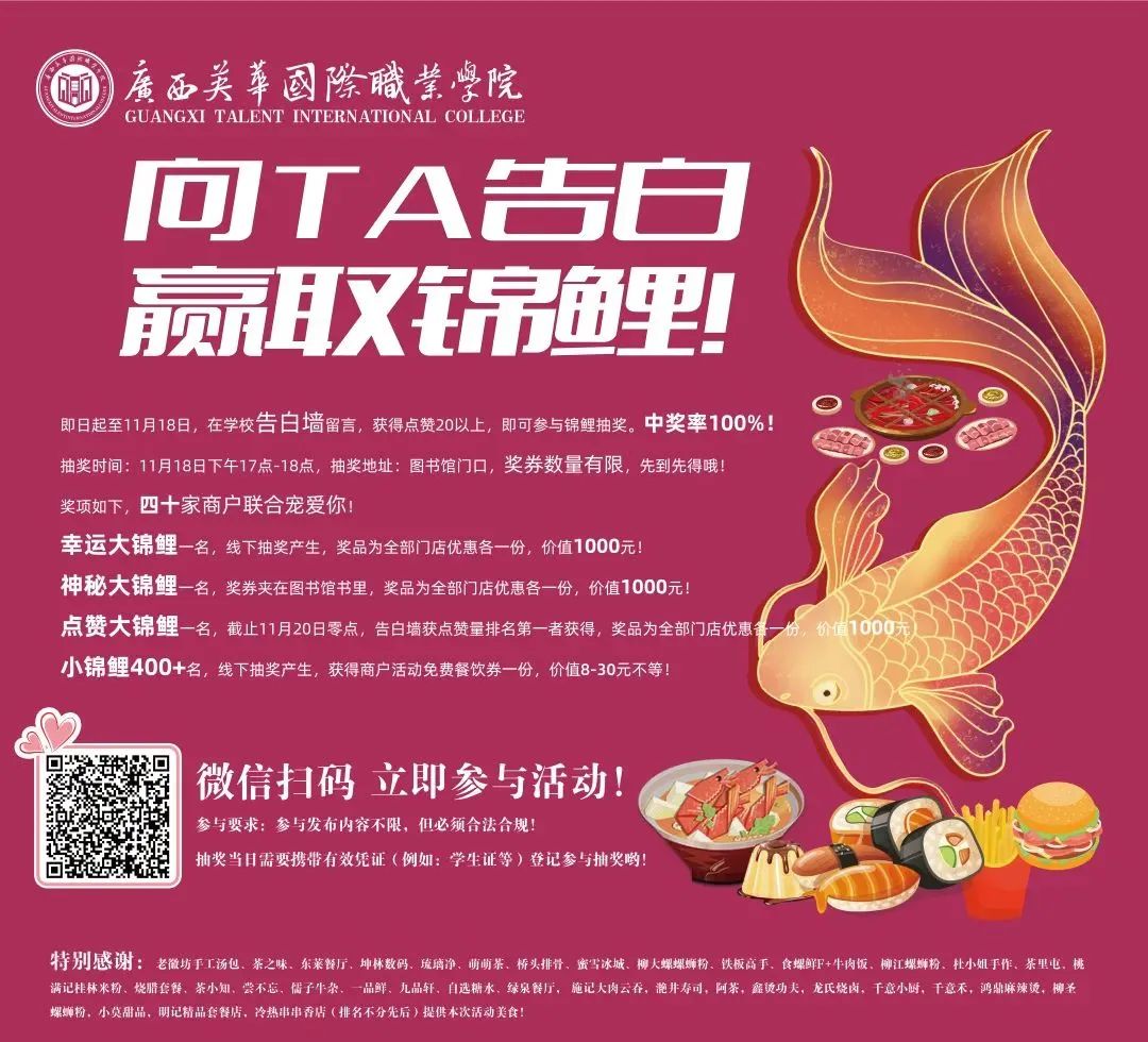 为了让你成为广西英华最炫酷的学子,学校为你准备了千元锦鲤大礼,让你吃喝随心所欲,吃吃吃!