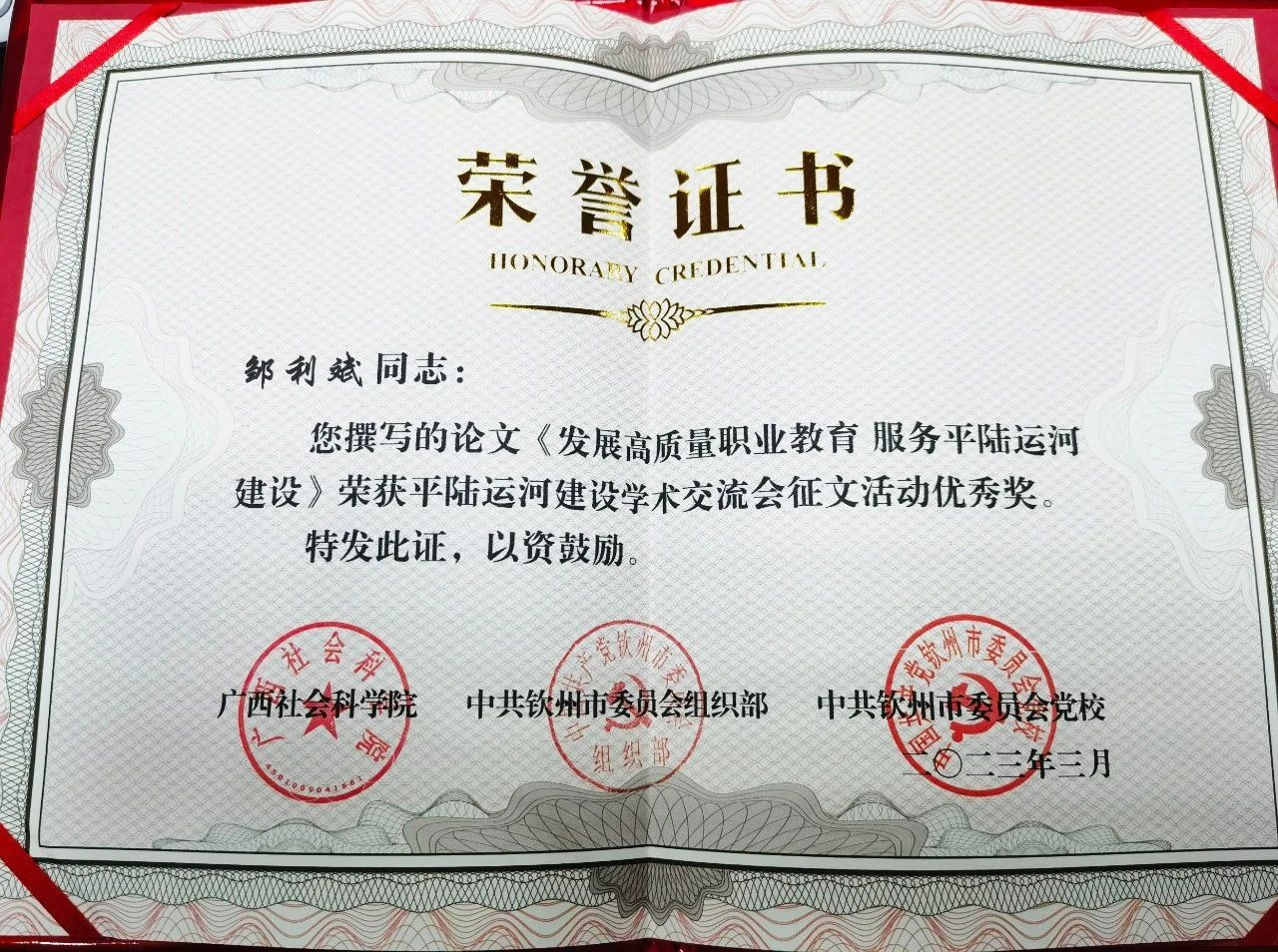 3月10日,由广西社科院、钦州市委组织部共同主办的平陆运河建设学术交流会在钦州召开。我校校长邹利斌,校党委书记黄家良,副校长赵春辉,校长助理叶春珍,以及教务处处长陈广晓,继续教育学院院长丁雪萍参加会议。会议对活动征集的获奖论文进行表彰,校长邹利斌的论文《发展高质量职业教育 服务平陆运河建设》荣获优秀论文奖。