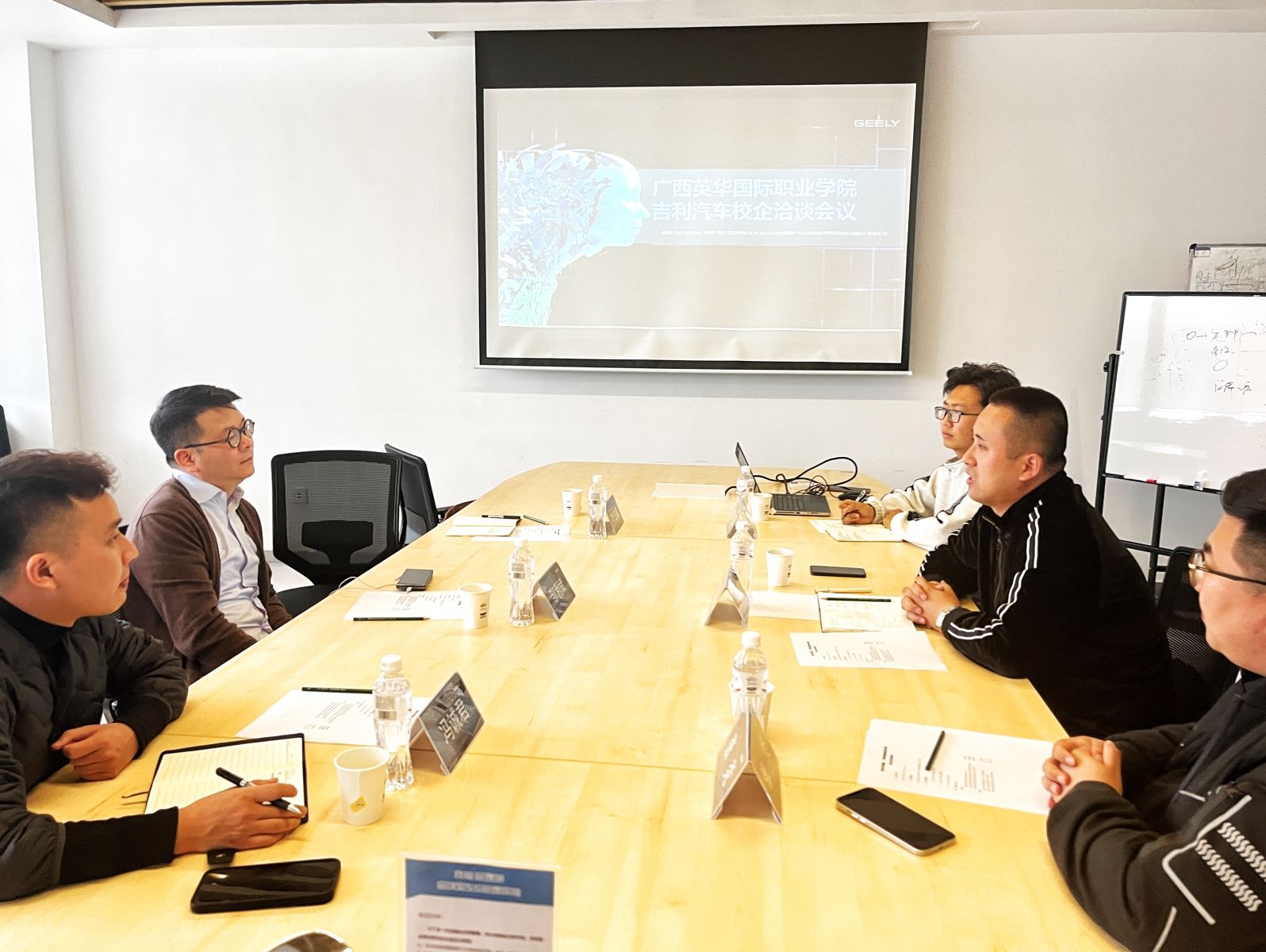 吉利汽车集团技能人才经营部部长吴祥宇、西南大区经理张炎、校企合作区域负责人高涵对邹利斌校长一行的到来热情接待,并召开校企合作洽谈会。会上,吴祥宇部长对吉利集团的发展情况、产教融合项目、岗位设置与需求等内容进行详细介绍;邹利斌校长对广西英华国际职业学院的教育改革、办学、校企合作情况进行介绍,并着重对23届和往届毕业生的就业状况进行跟踪调查,并将信息反馈到日常就业工作中,改进就业指导工作方式方法;同时期待校企双方深化订单班合作,从培养目标、课程设置、实践实习等为切入点出发,为新能源汽车专业发展提供支持。