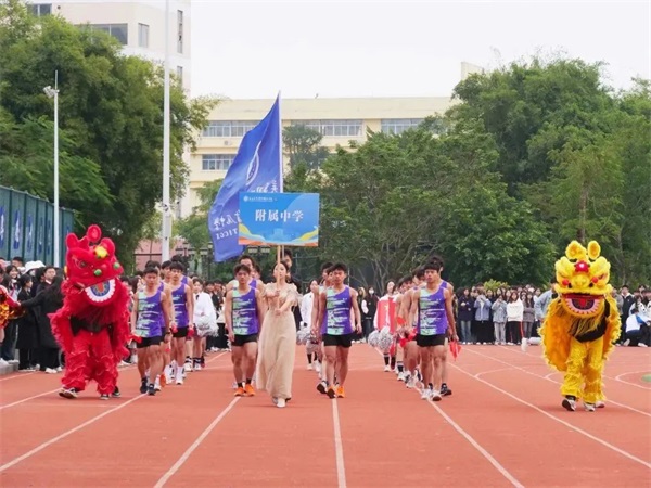 别样的风采,高昂的斗志。在迈着整齐划一、铿锵有力的步伐向我们走来的是附中代表队。他们精神饱满,充满自信,有会当凌绝顶,一览众山小的信念;他们意气风发、精神抖擞,有奋勇争先,力争第一的追求。