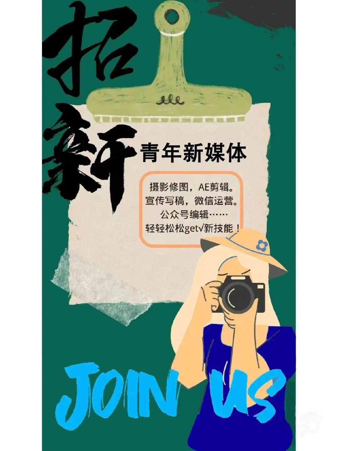 青年新媒体中心前身为大学生记者团,2022年6月12日转制扩编为青年新媒体中心。在青年新媒体中心这里,你们可以创意想象,开放思维,洞察当代青年的所思所爱,拿捏校园热点和新鲜事物,然后把它们用灵动的文字呈现在学校的各大新媒体平台,以英华新青年的公众号视频号为主,还有微博,抖音等等。或是学校实时活动和新闻的报道;或是紧跟新鲜潮流;或是编写视频脚本...还有和你们一起并肩作战的我们!一群对摄影、设计、推文热爱的学长学姐,我们是认真负责热爱工作,和蔼可亲的学长学姐...22级的特工们,你们是不是已经准备好加入我们青年新媒体中心了呢?
