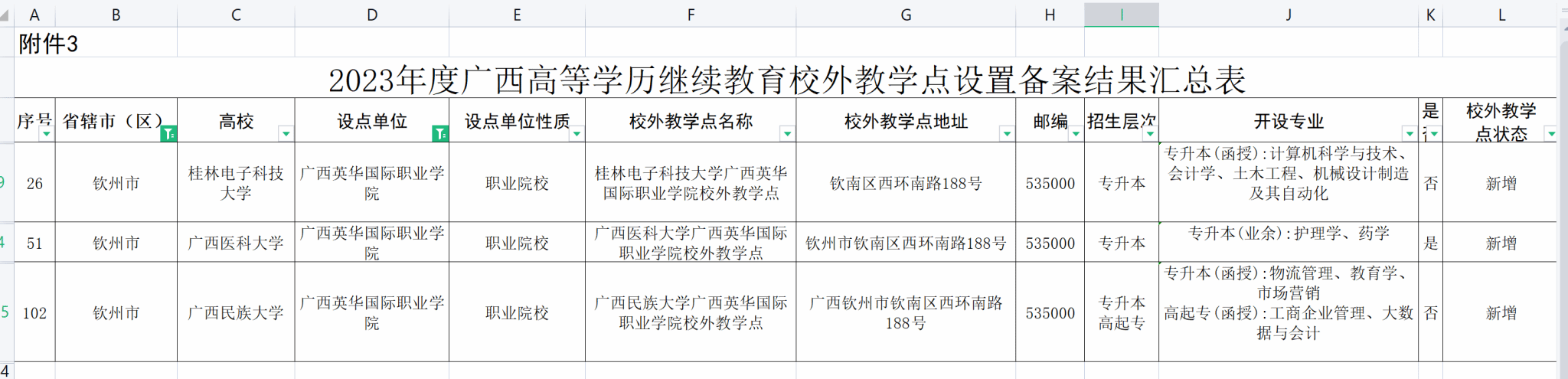 根据桂教职成〔2023〕41号《自治区教育厅关于公布2023年高等学历继续教育拟招生专业备案结果和校外教学点设置备案结果的通知》,广西英华国际职业学院成功新增桂林电子科技大学、广西医科大学和广西民族大学高等学历继续教育校外教学点。涉及到计算机科学与技术、会计学、土木工程、护理、药学、物流、教育学及市场营销等10个招生专业。