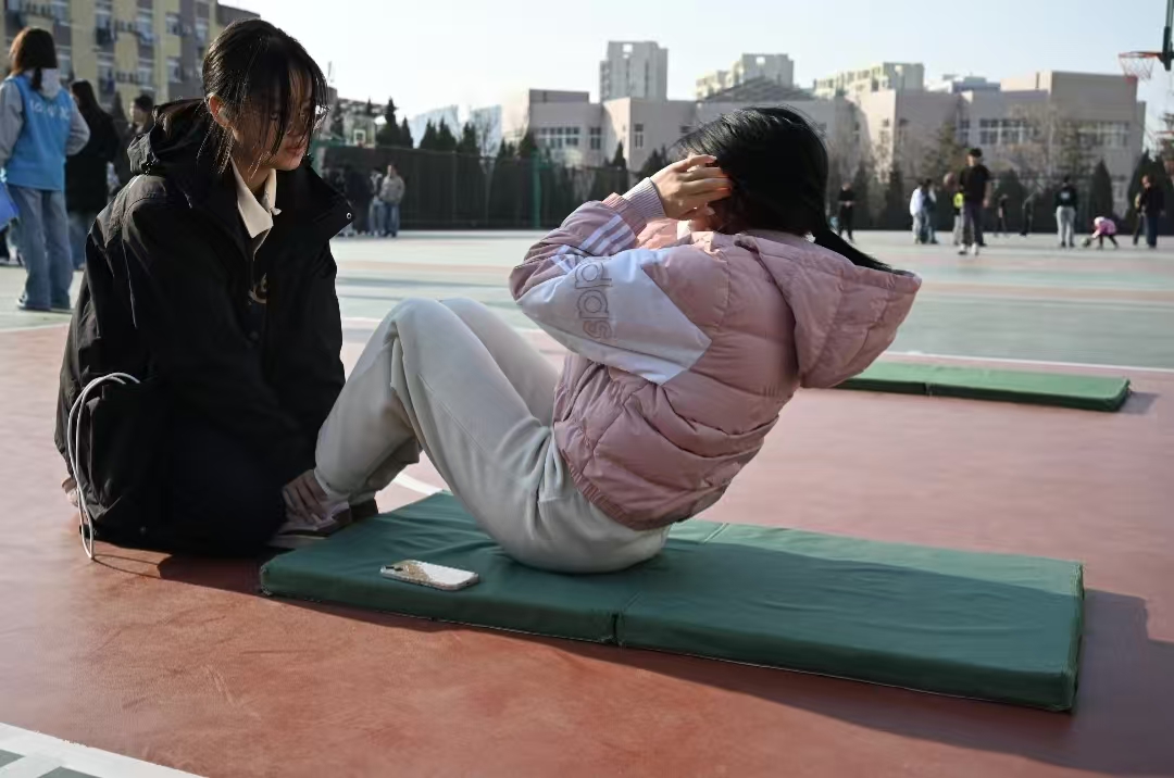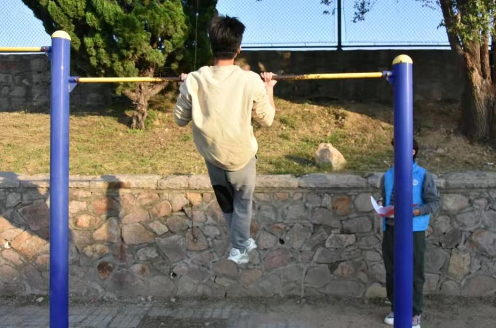 赛场之上,斗志昂扬。男生组队员紧握单杠,奋力上拉,用标准动作诠释坚持的力量;女生组队员平躺垫上,节奏稳定,以坚韧耐力展现青春风采。每一次起身、每一次上拉,都是对自我的超越,更是团队精神的凝聚。