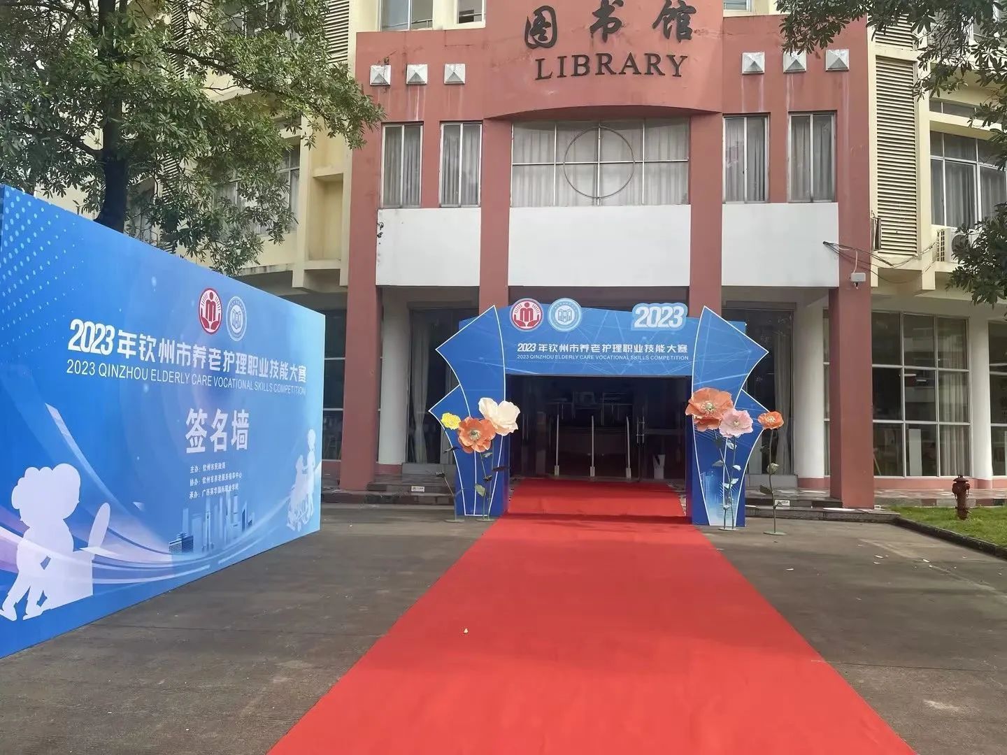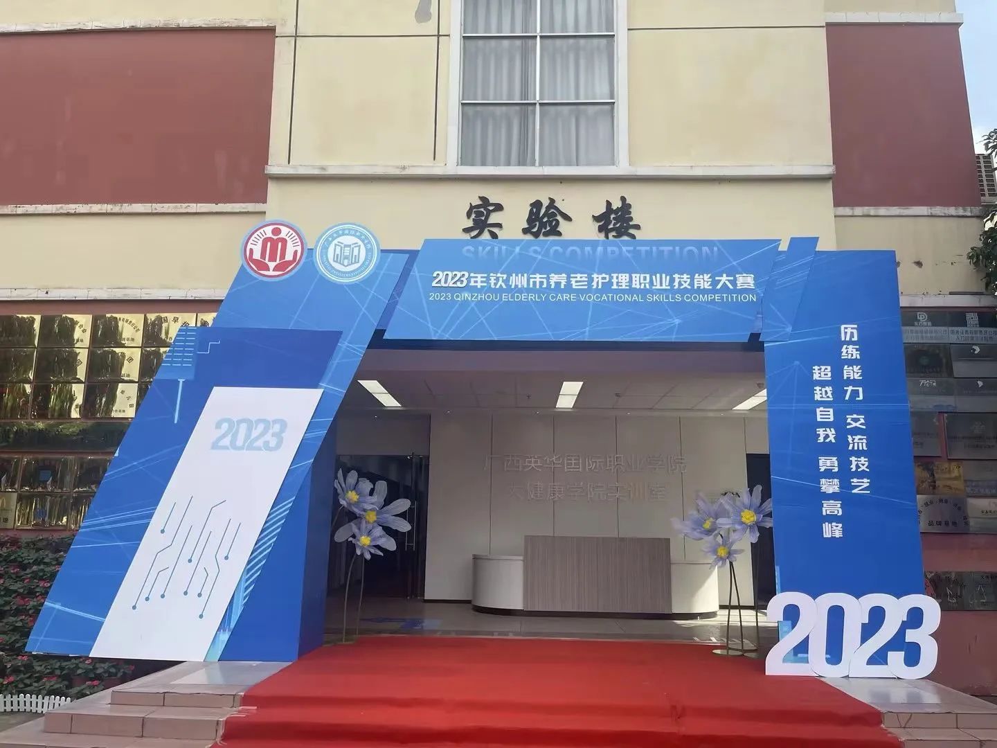 近日,广西英华国际职业学院校园布置高档大气,一整套商务蓝调的装饰物料氛围感拉满,沿路飘扬的道旗,几百米的红毯一路延伸,尽头是多座风格别致的精美拱门,还有相得益彰的签名墙,荧幕大屏,引众人驻足围观。一探究竟,原来是钦州市民政局2023年钦州市养老护理职业技能大赛在这里举办。
