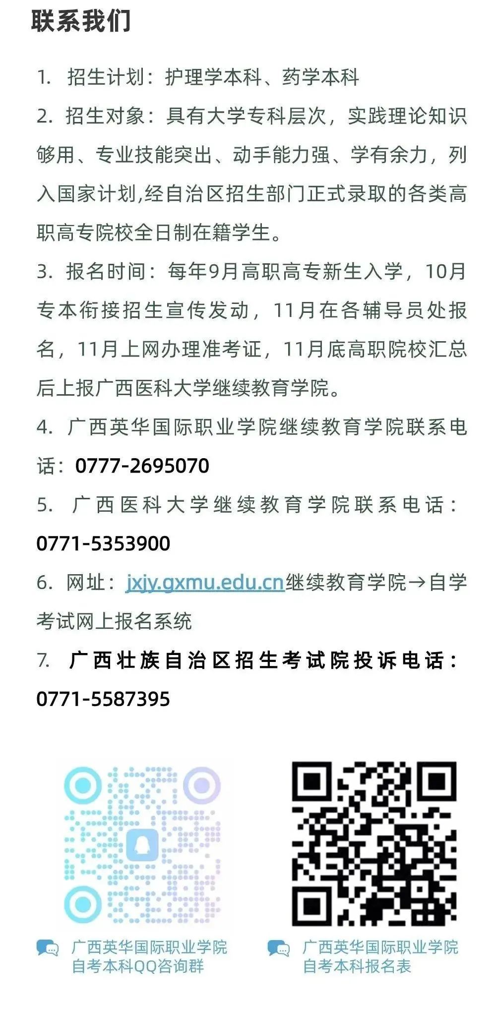 2023年初,广西英华国际职业学院与广西医科大学自考专本衔接签署合作办学协议,这标志着我校护理专业2000多名学生终于有机会跻身广西区医学类最顶尖的学府提升学历。于2023年起,我校成为广西医科大学成人继续教育校外办学点,此合作将为更多校内外学生提供学历提升的机会。两项合作不仅为我校护理专业的学子搭建学历提升的平台,同时也为我校教师提高教学教研水平提供了良好的机会,更好地助力我校大健康学院专业的建设与发展。
