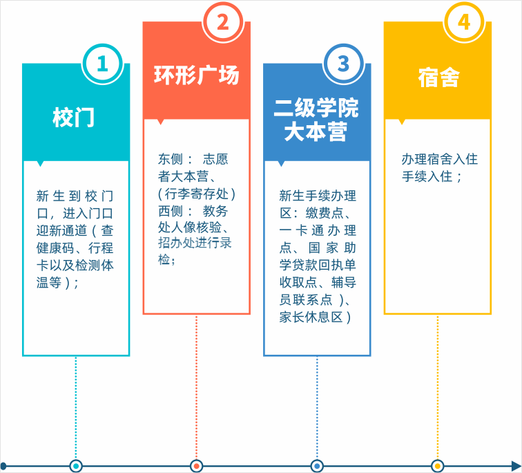 新生入学手续办理区、家长休息区。新生入学手续办理区设国家贷款回执单收取点、财务缴费点、财务一卡通办理点、辅导员联系点、本科示范班咨询点-名企就业班咨询点。