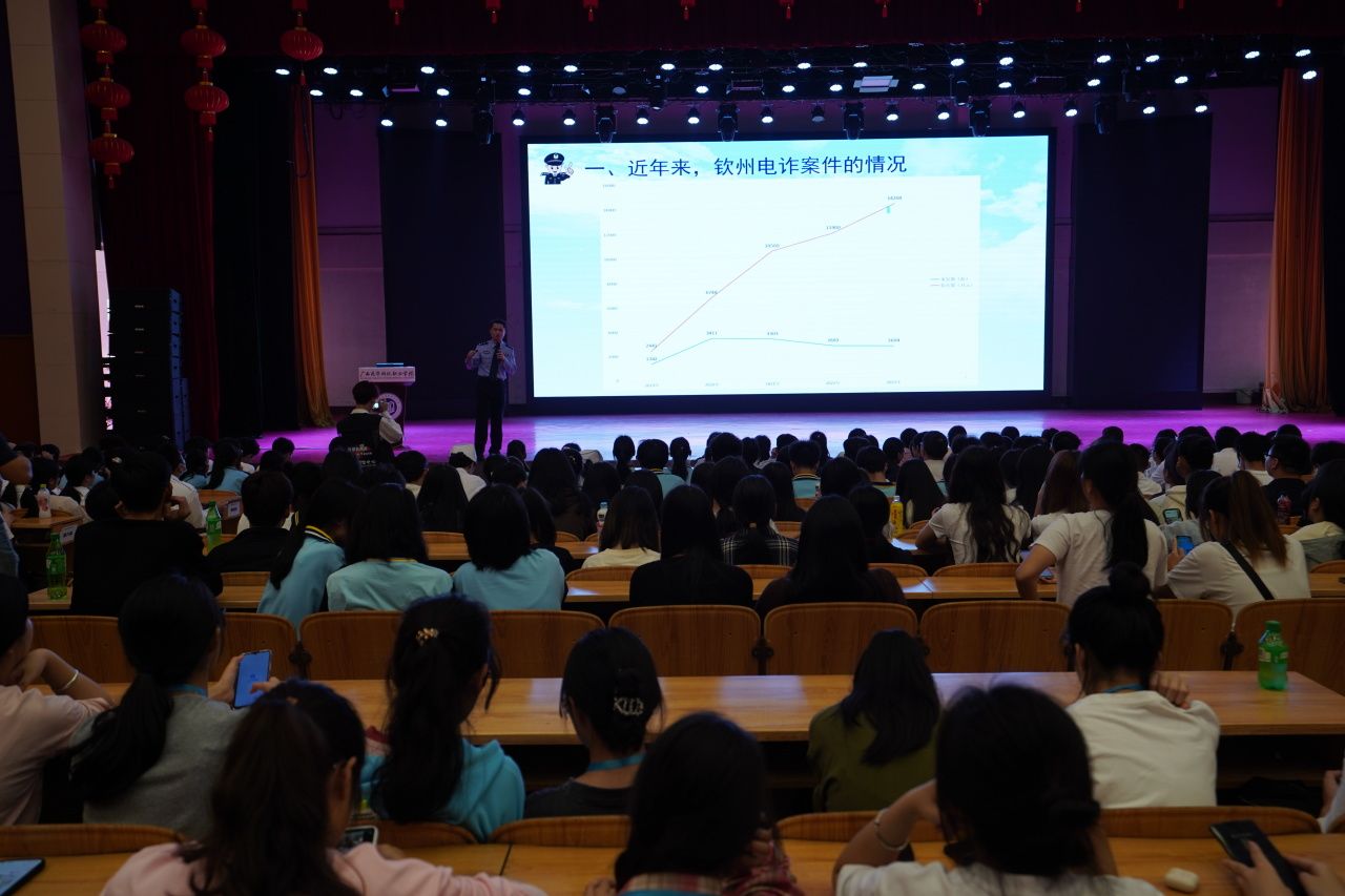 “广西青年反诈联盟”启动仪式后,钦南反诈中心进行反诈互动课程教学,讲解近期诈骗类型、典型案例,开展“两卡”及出境参与电信网络诈骗违法犯罪普法宣传。