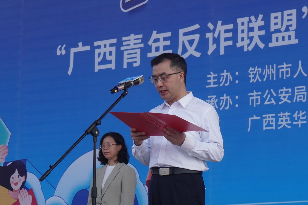 钦州市人民政府副市长、公安局党委书记、局长龙校,广西英华国际职业学院党委书记黄家良,市公安局、市委宣传部、共青团市委、市教育局、市通管办、市卫健委、人民银行钦州市中心支行、工商银行钦州分行分管反诈工作的领导出席活动。