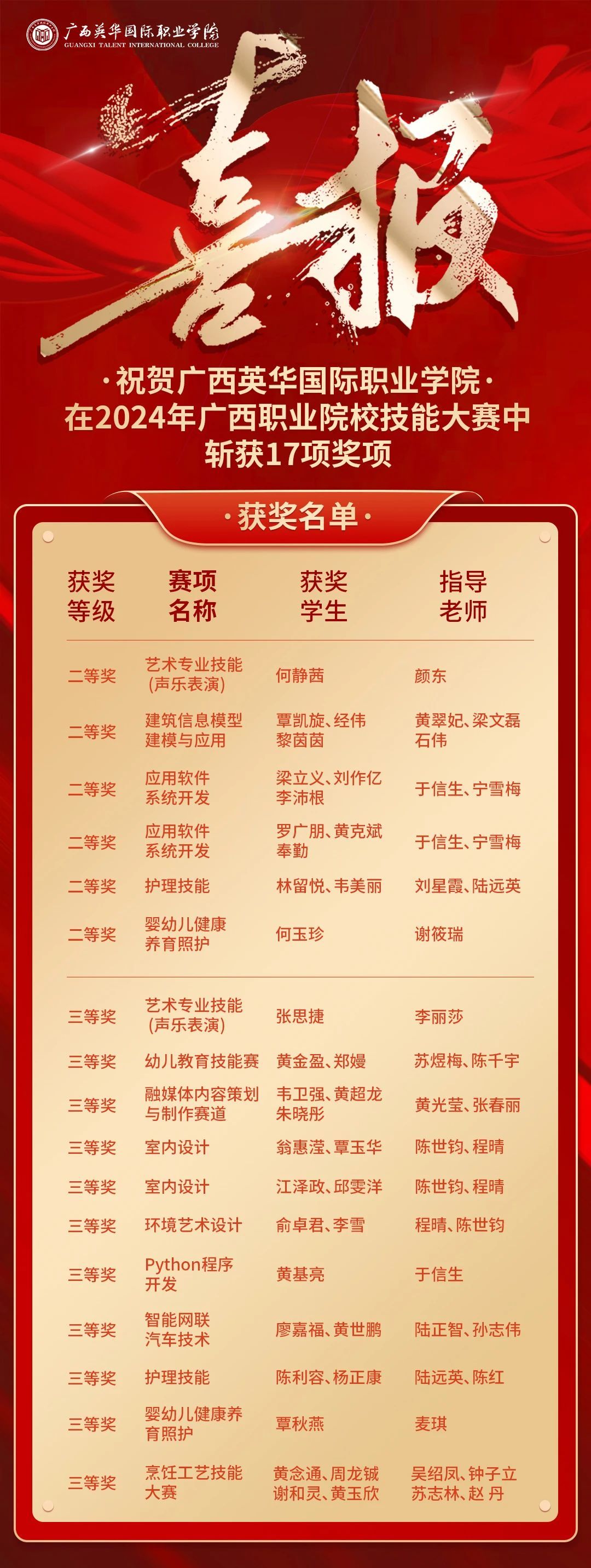 2024年广西职业院校技能大赛圆满落幕,广西英华国际职业学院斩获二等奖6项,三等奖11项,总计获奖17项,创造了我校参加广西职业院校技能大赛以来最好成绩,充分展示了我校的教育教学实力和水平。