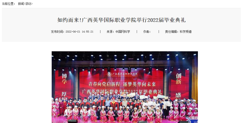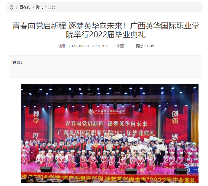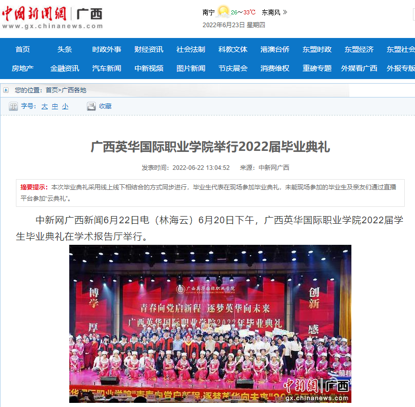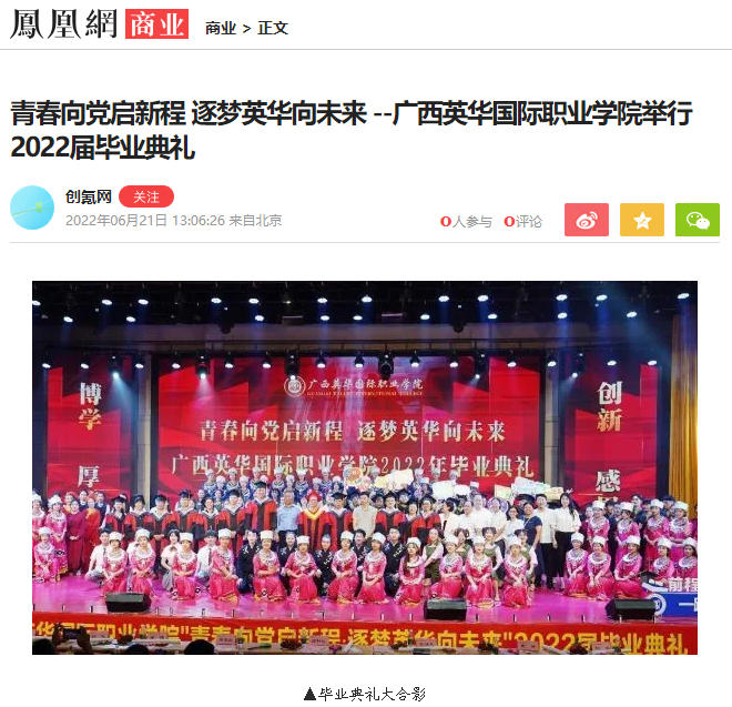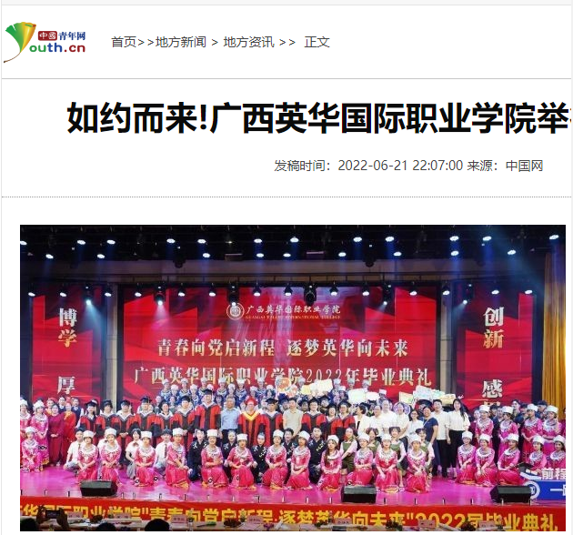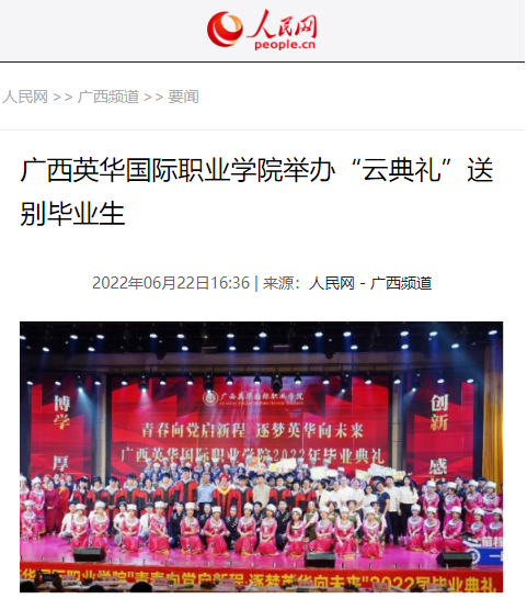 而这次广西英华国际职业学院2022届毕业典礼活动,被多家媒体报道:其中包括人民网、凤凰网、中国新闻网、中国青年网、国际在线新闻、未来网新闻、中国教育网、广西在线、网易新闻、新浪新闻等29家(其中央媒6家)主流媒体。