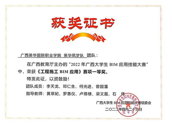 广西英华国际职业学院学子获2022年广西大学生BIM应用技能大赛一等奖