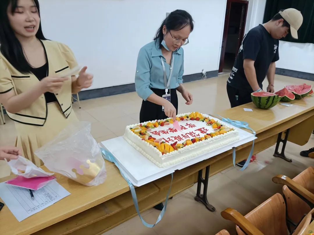 游戏环节结束,活动也接近了尾声,我院学生会给参会成员准备了丰富的零食小吃以及精美的礼品,学生会还准备了美味的蛋糕,同学们吃着蛋糕唱着歌,与老师合影留念,活动也在同学们欢声笑语中结束。