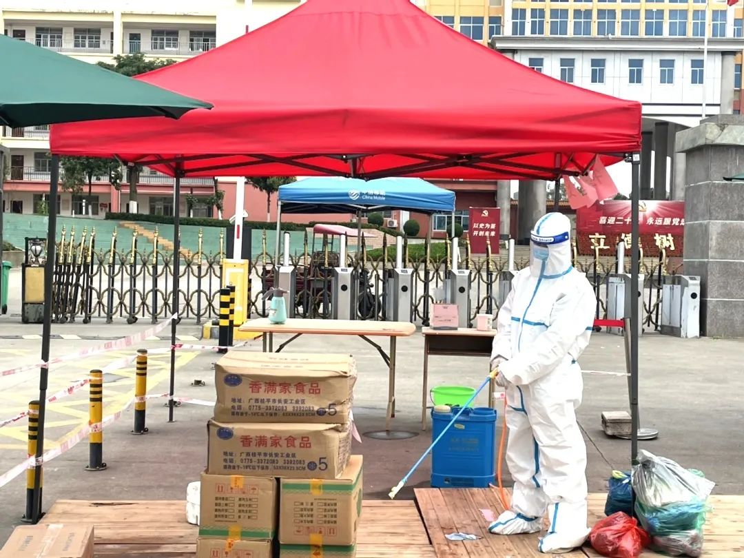 ▲校外物资接收点正在进行物资消杀