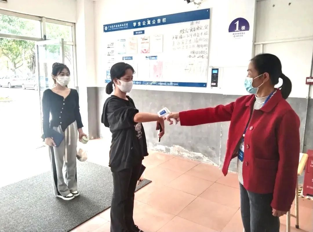 ▲宿管老师为同学们检测体温
