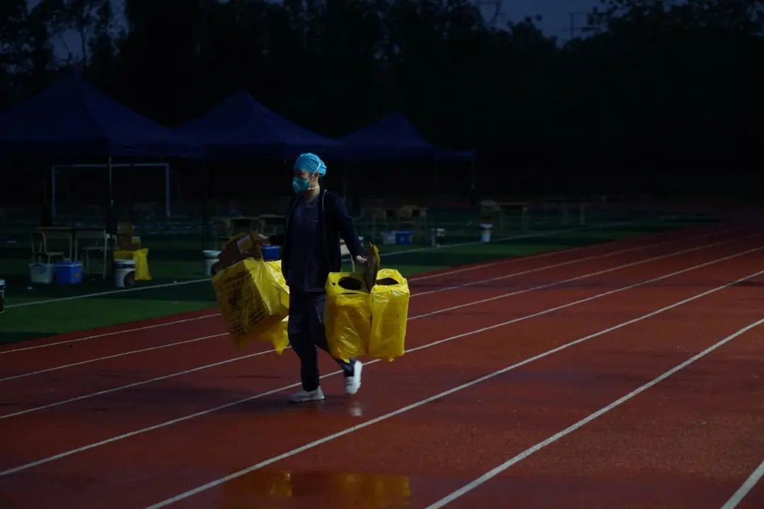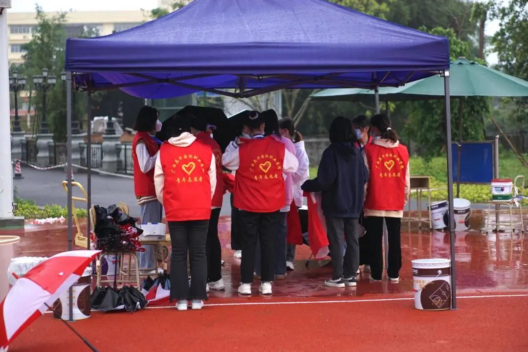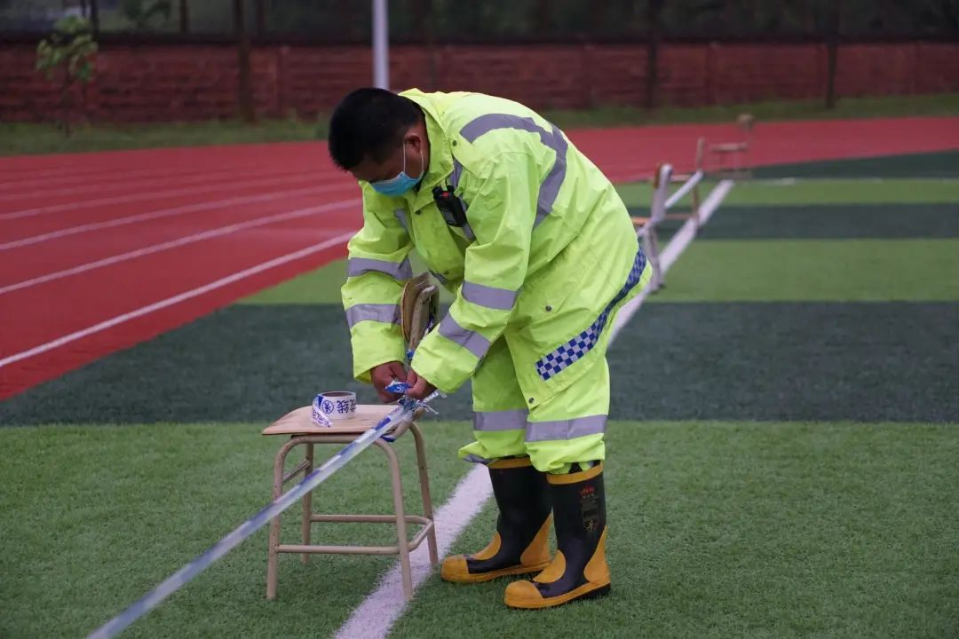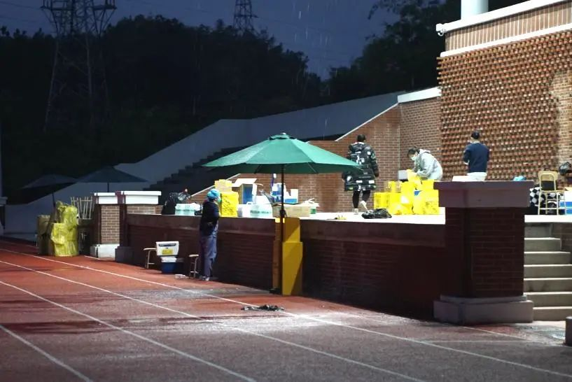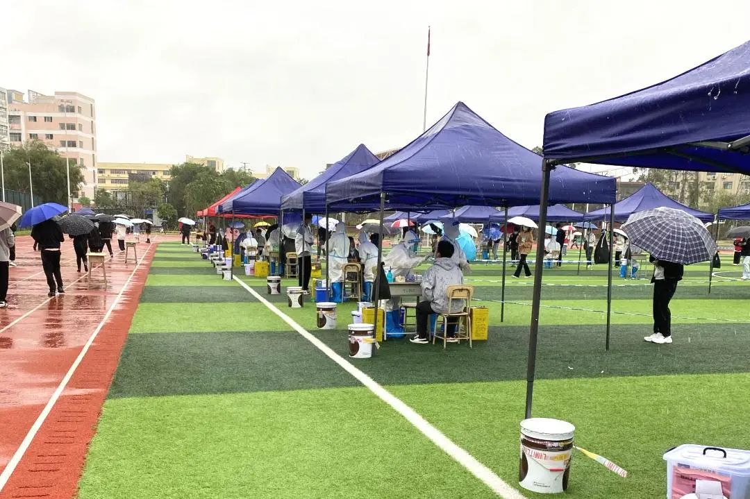 凌晨6点的英华校园真的很安静,只能听到狂风大雨的嘈杂声,还有隐约响起脚步声和一群在风雨里忙碌的身影。为了全校师生按时、顺利地完成核酸检测,他们早早来到运动场做好准备工作。