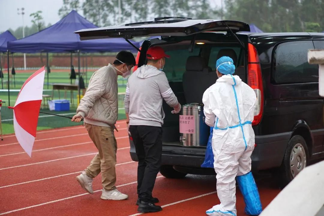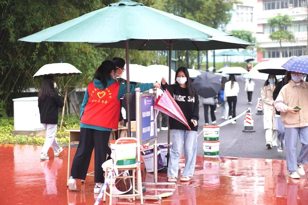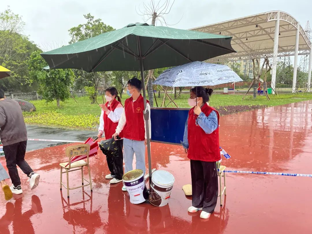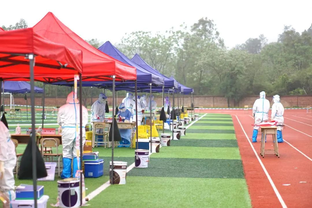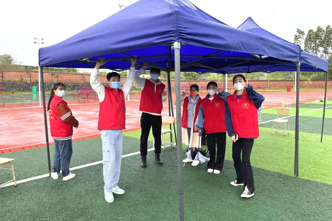 凌晨6点的英华校园真的很安静,只能听到狂风大雨的嘈杂声,还有隐约响起脚步声和一群在风雨里忙碌的身影。为了全校师生按时、顺利地完成核酸检测,他们早早来到运动场做好准备工作。