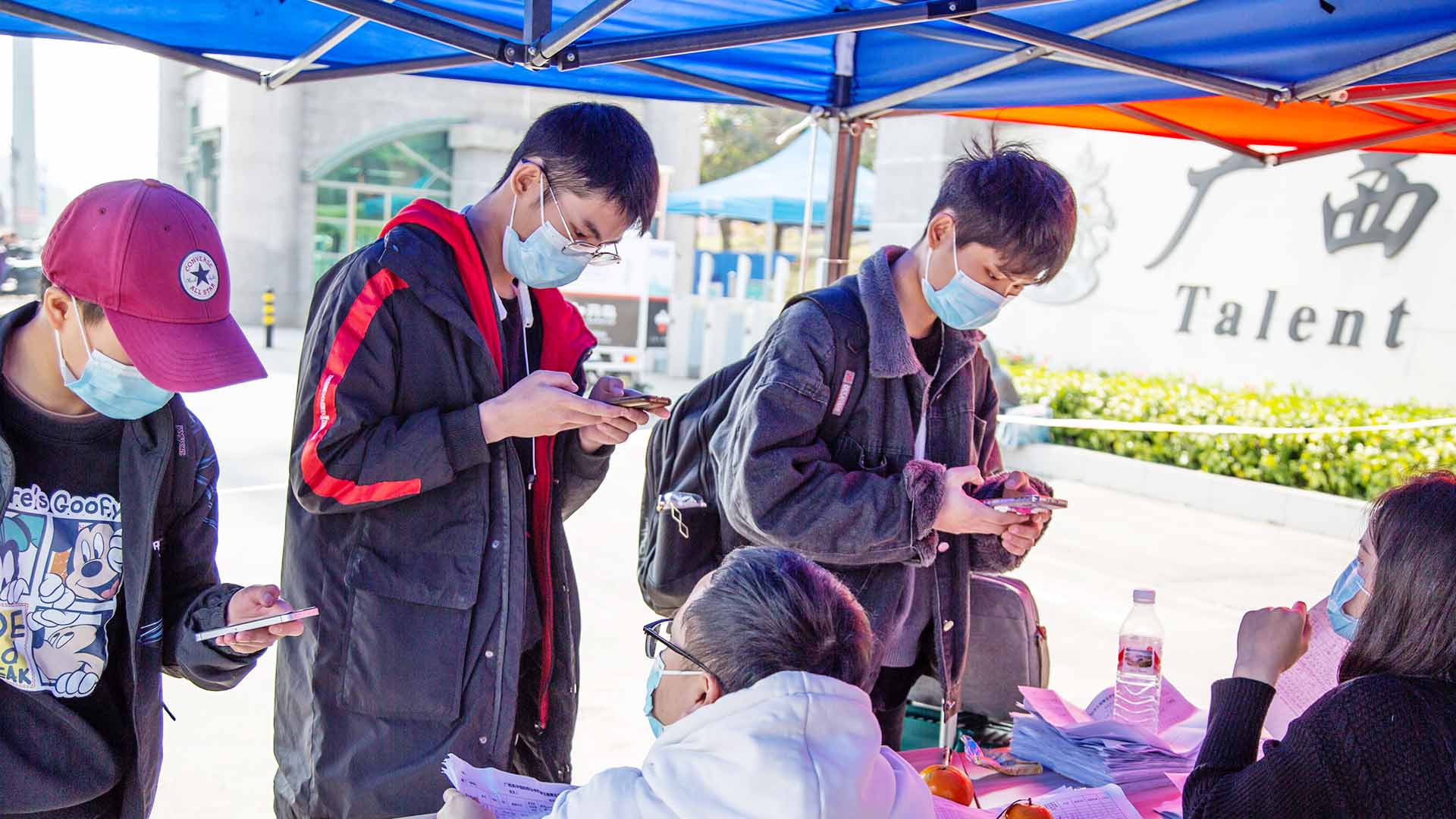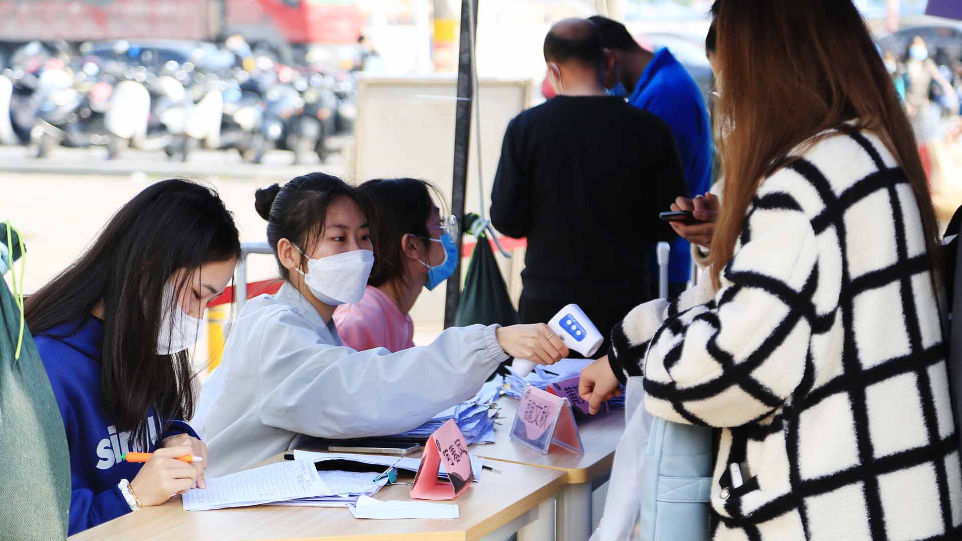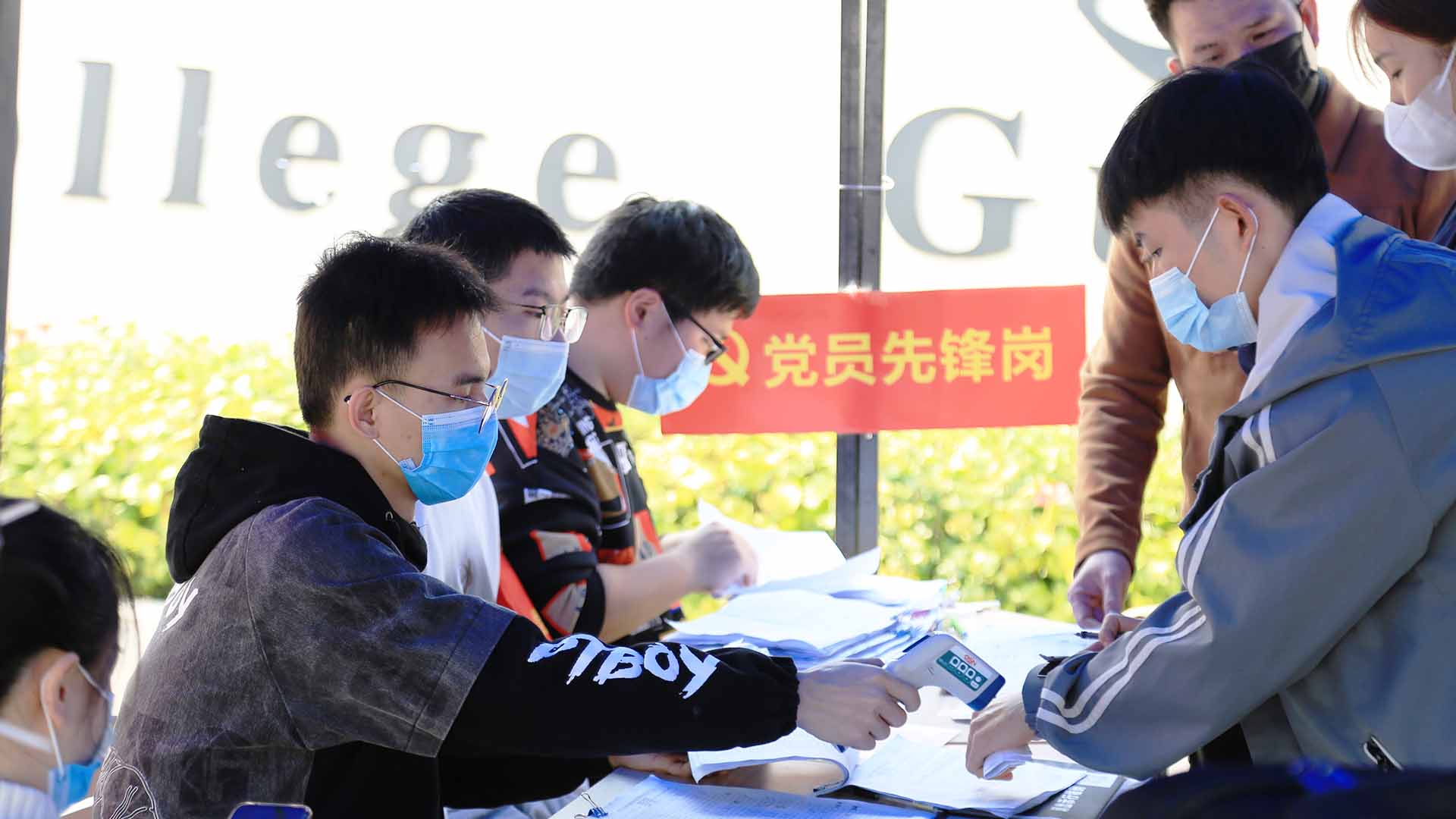 “同学,请佩戴好口罩,扫码入校。”